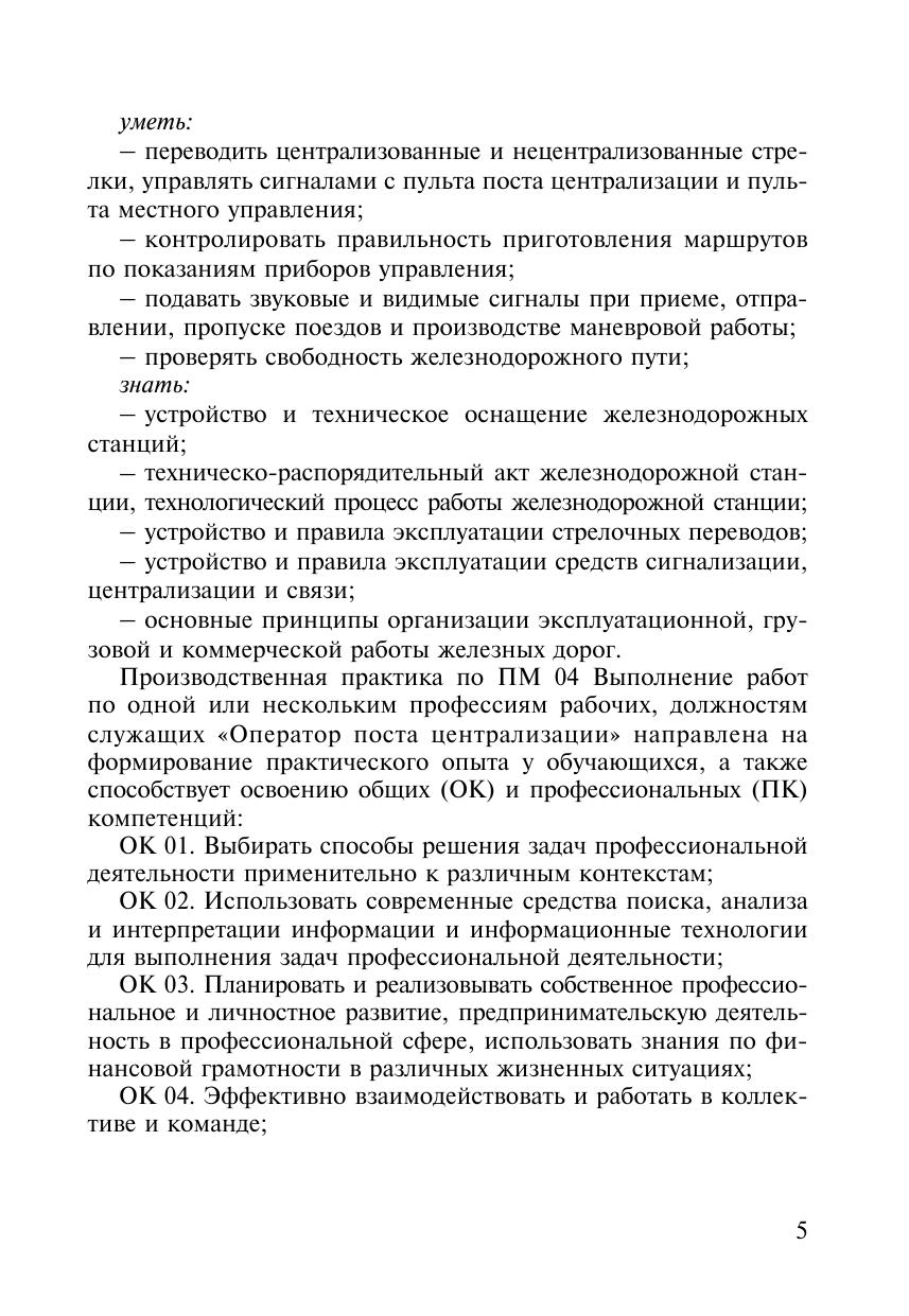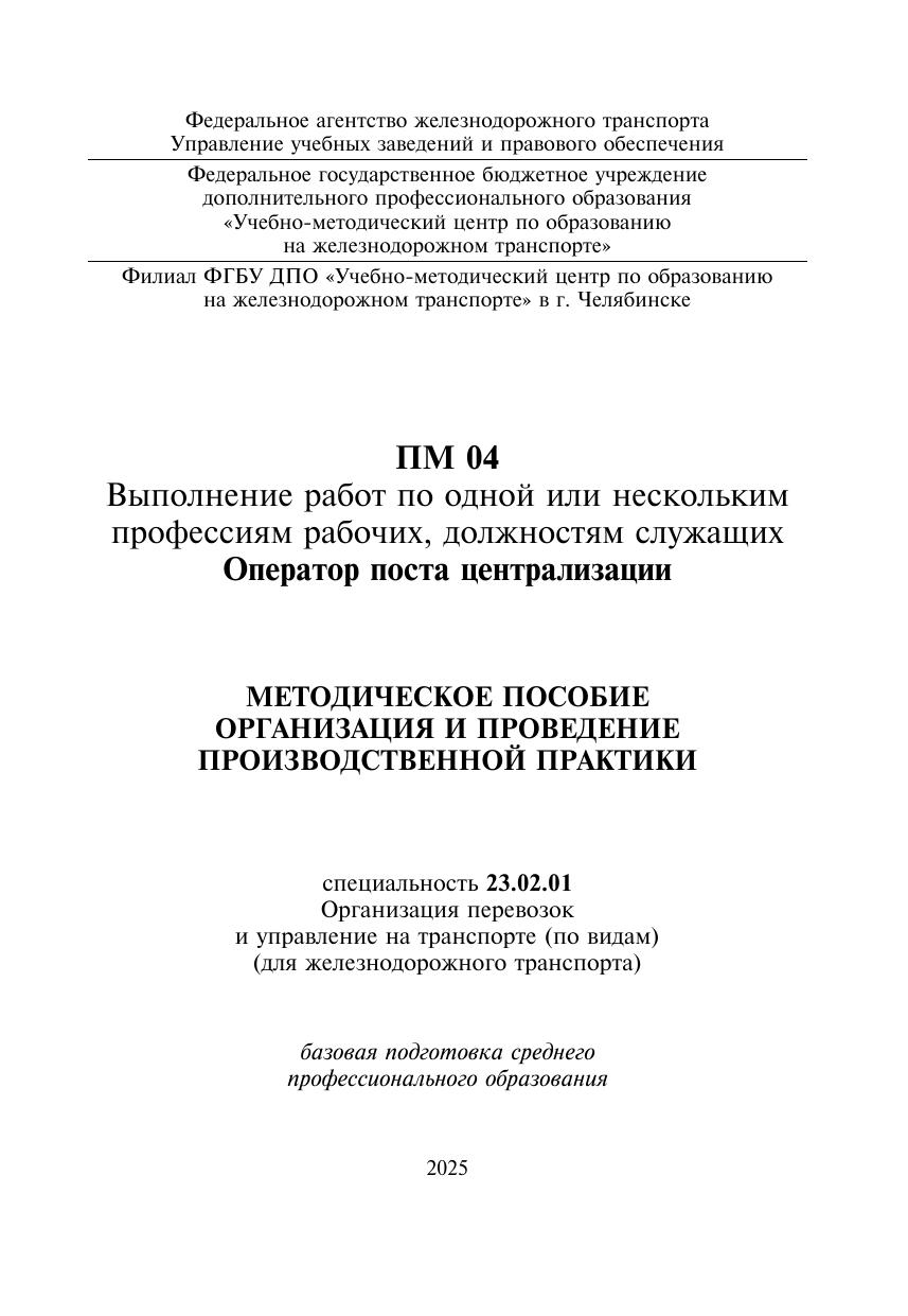 Кайгородова, Е. В. Методические пособие Организация и проведение производственной практики ПМ 04 Выполнение работ по одной или нескольким профессиям рабочих, должностям служащих (Оператор поста централизации) : методическое пособие / Е. В. Кайгородова. — Москва : УМЦ ЖДТ, 2025. — 52 с. — Текст : электронный // УМЦ ЖДТ : электронная библиотека. — URL: https://umczdt.ru/books/1258/296672/ (дата обращения 08.02.2026). — Режим доступа: по подписке.