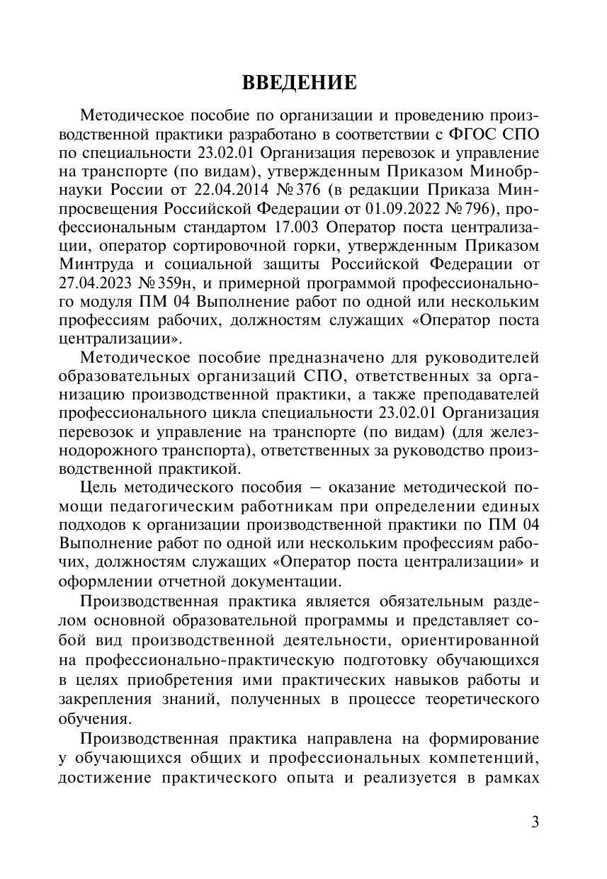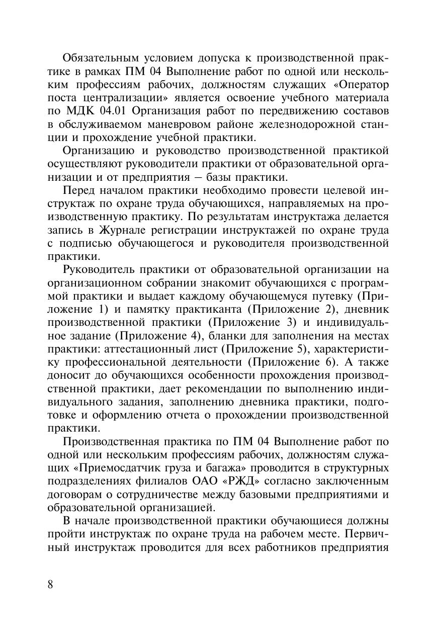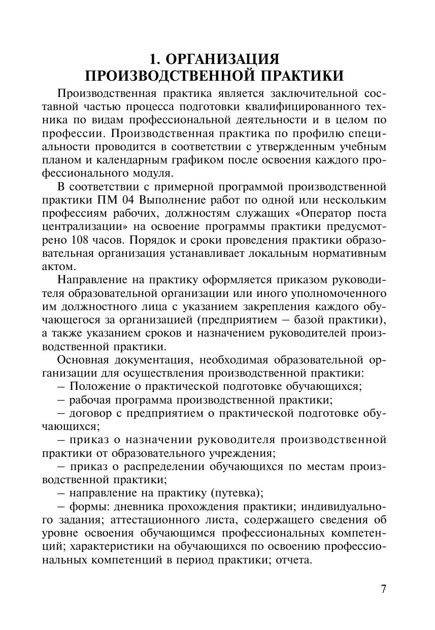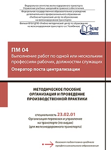 Методическое пособие разработано в соответствии с ФГОС СПО по специальности 23.02.01 Организация перевозок и управление на транспорте и ПП ПМ 04 Выполнение работ по одной или нескольким профессиям рабочих, должностям служащих (Оператор поста централизации). Предназначено руководителям и преподавателям ОО СПО, ответственным за организацию и проведение производственной практики.