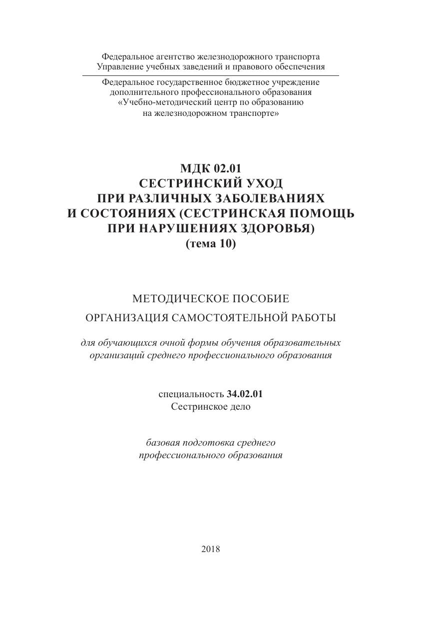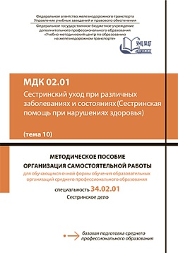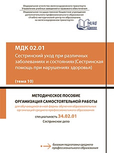 Шпилева, О.А. МДК 02.01 Сестринский уход при различных заболеваниях и состояниях (Сестринск ая помощь при нарушениях здоровья) (тема 10). МП "Организация самостоятельной работы" : методическое пособие / О. А. Шпилева. — Москва : ФГБУ ДПО «Учебно-методический центр по образованию на железнодорожном транспорте», 2018. — 68 с. — Текст : электронный // УМЦ ЖДТ : электронная библиотека. — URL: https://umczdt.ru/books/1261/223469/ (дата обращения 08.02.2026). — Режим доступа: по подписке.