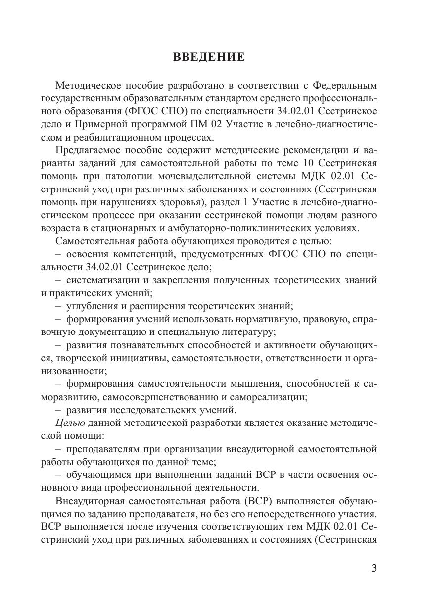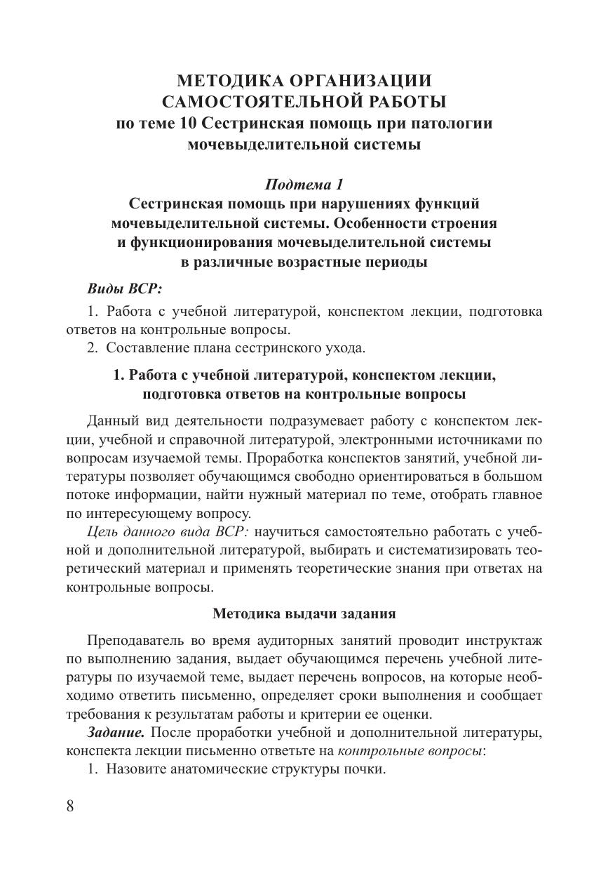 Предлагаемое пособие содержит методические рекомендации и варианты заданий для самостоятельной работы по теме 10 Сестринская помощь при патологии мочевыделительной системы МДК 02.01 Сестринский уход при различных заболеваниях и состояниях (Сестринская помощь при нарушениях здоровья), раздел 1 Участие в лечебно-диагностическом процессе при оказании сестринской помощи людям разного возраста в стационарных и амбулаторно-поликлинических условиях.