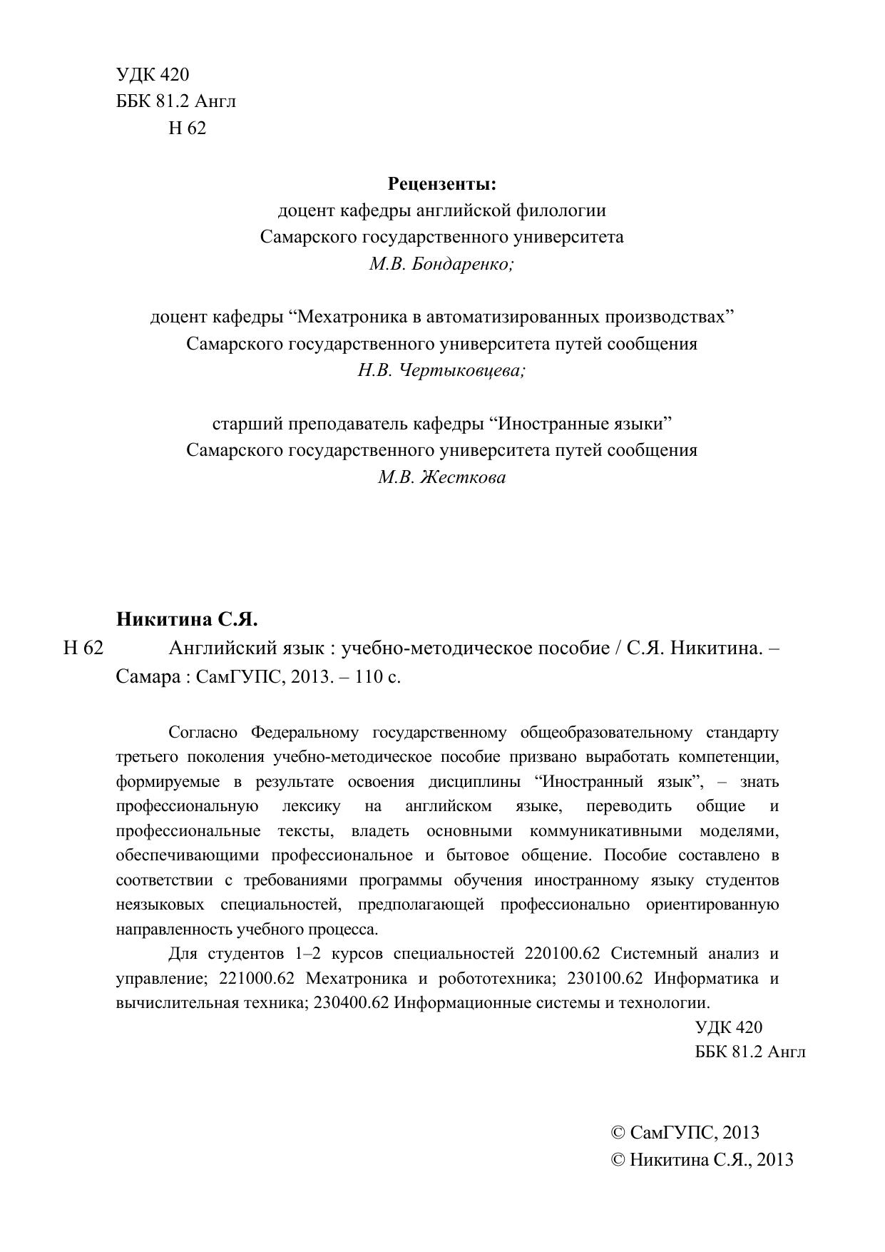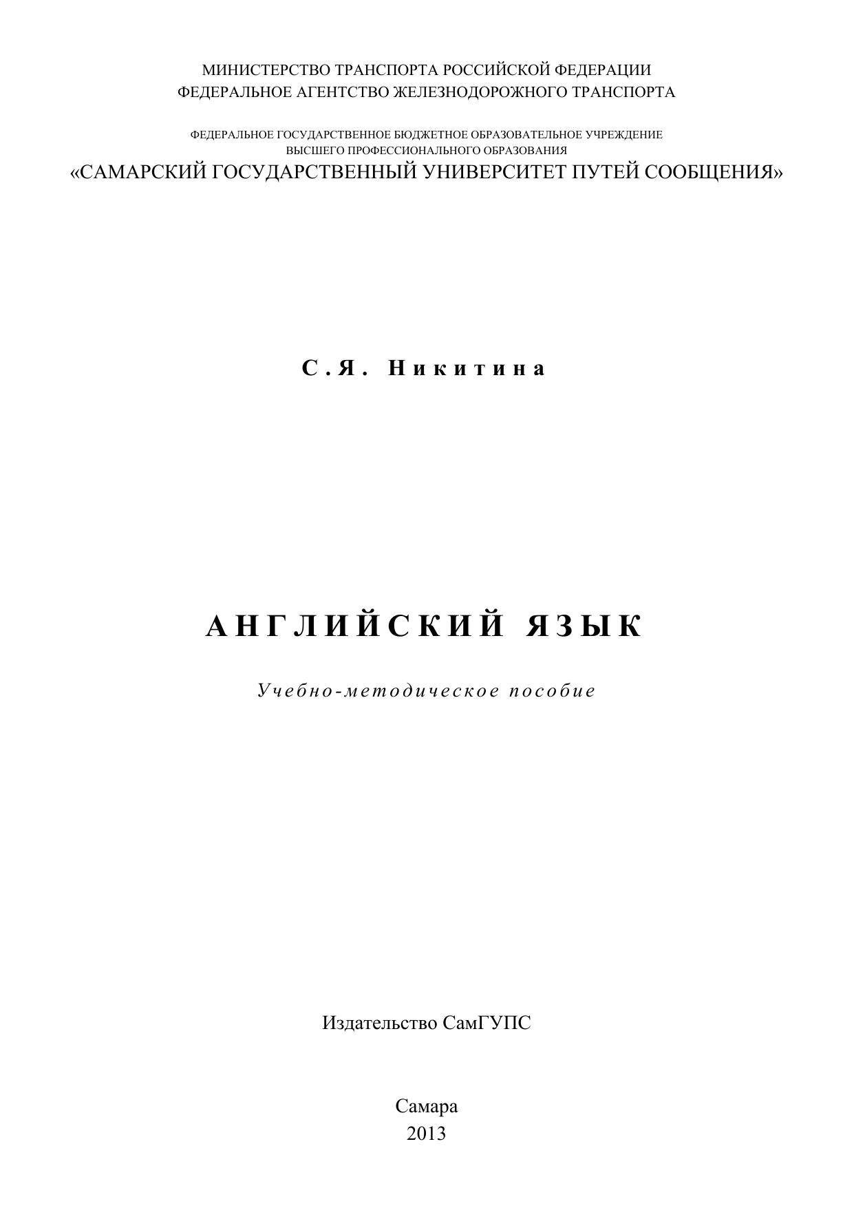 Никитина, С.Я. Английский язык : учебно-методическое пособие / С. Я. Никитина. — Самара : СамГУПС, 2013. — 110 с. — Текст : электронный // УМЦ ЖДТ : электронная библиотека. — URL: https://umczdt.ru/books/1277/263431/ (дата обращения 22.04.2026). — Режим доступа: по подписке.