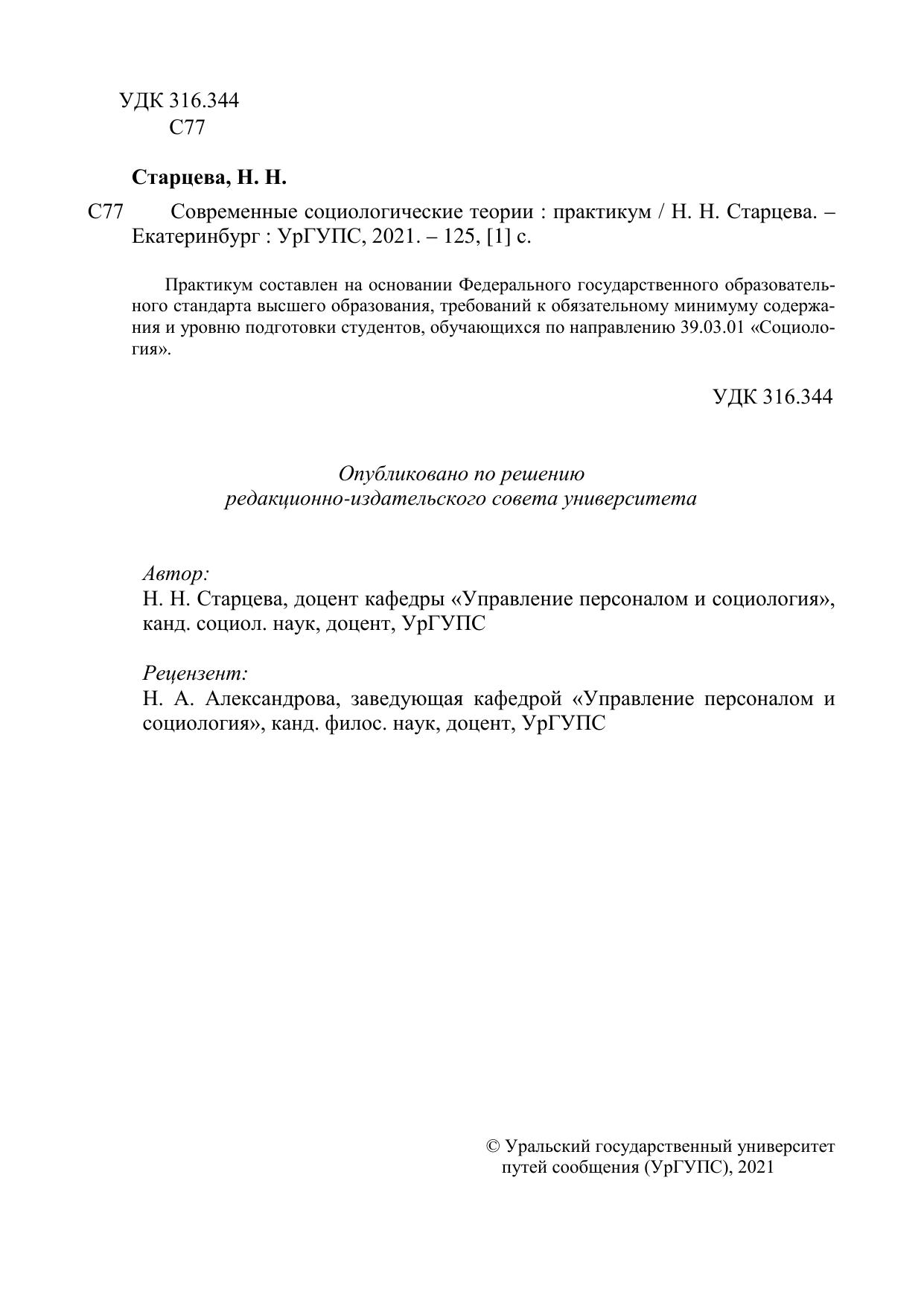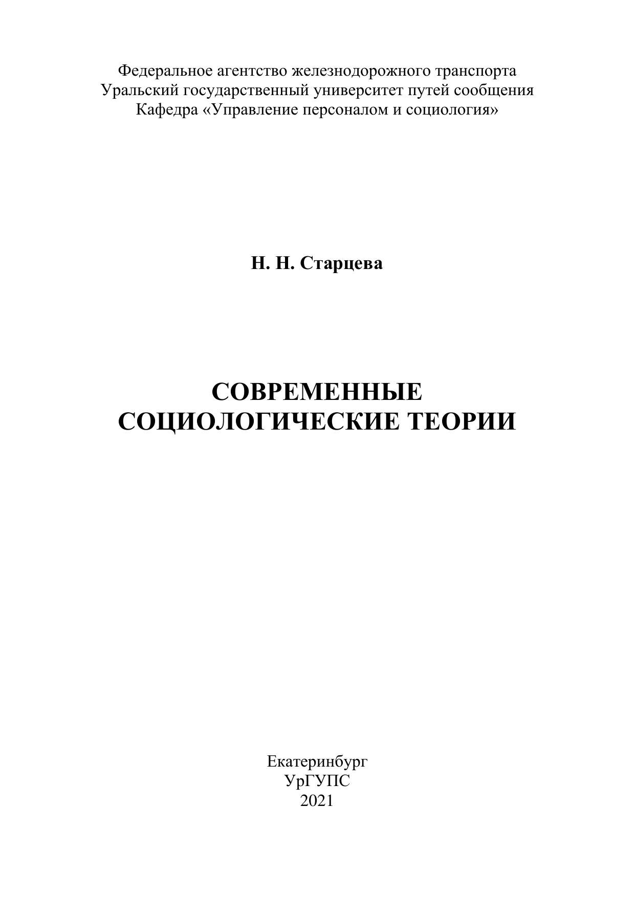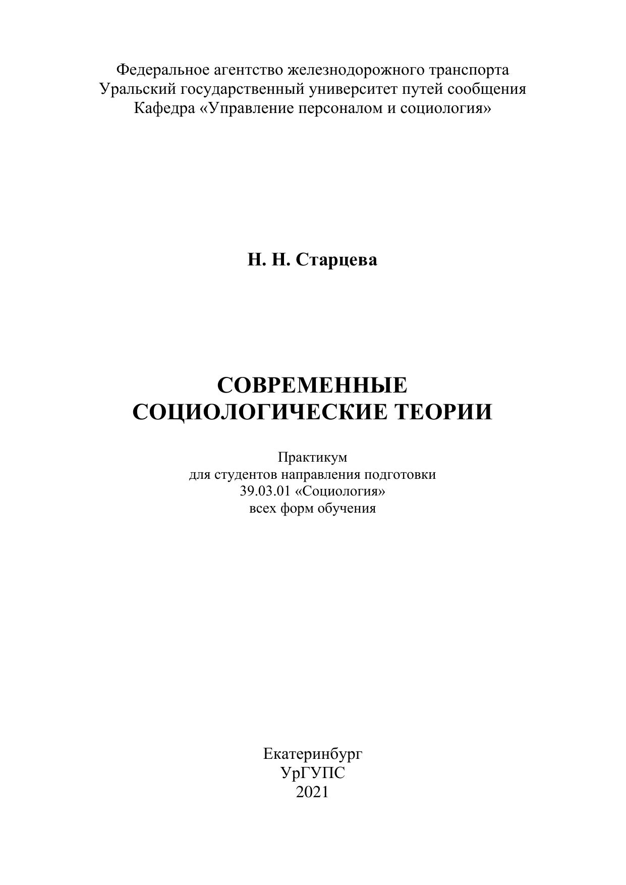 Старцева, Н.Н. Современные социологические теории : практикум / Н. Н. Старцева. — Екатеринбург : УрГУПС, 2021. — 126 с. — Текст : электронный // УМЦ ЖДТ : электронная библиотека. — URL: https://umczdt.ru/books/1306/262071/ (дата обращения 21.04.2026). — Режим доступа: по подписке.