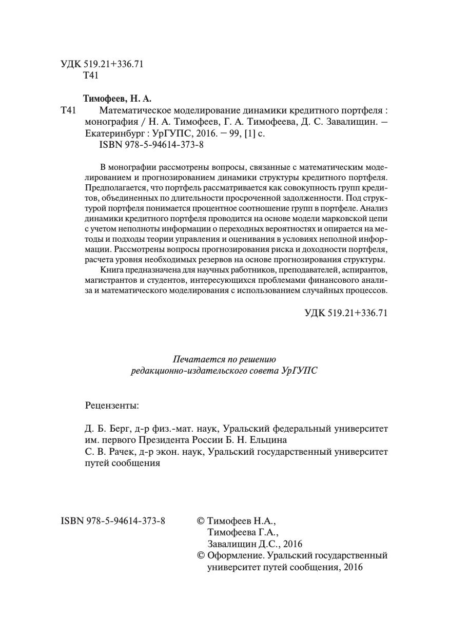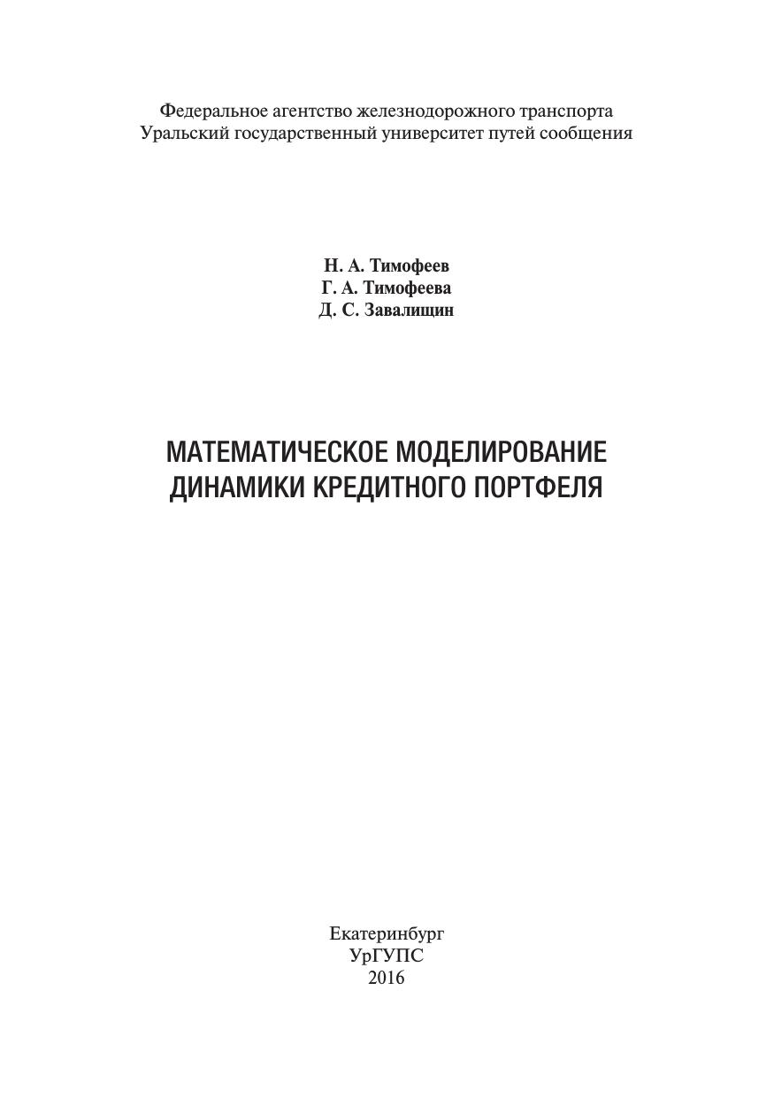 Завалищин, Д.С. Математическое моделирование динамики кредитного портфеля : монография / Г. А. Тимофеева, Д. С. Завалищин, Н. А. Тимофеев, Г. А. Тимофеева, Д. С. Завалищин. — Екатеринбург : УрГУПС, 2016. — 99 с. — 978-5-94614-373-8. — Текст : электронный // УМЦ ЖДТ : электронная библиотека. — URL: https://umczdt.ru/books/1306/263224/ (дата обращения 20.04.2026). — Режим доступа: по подписке.