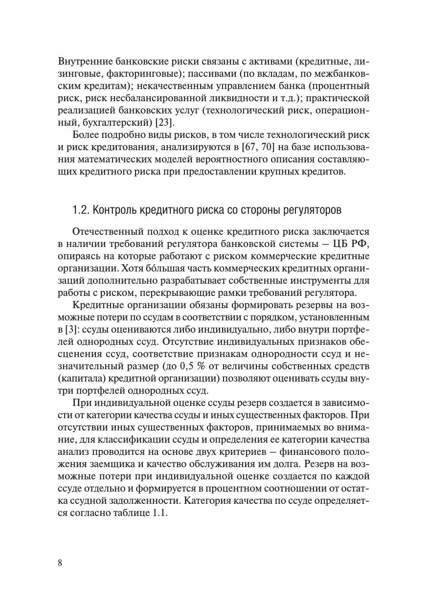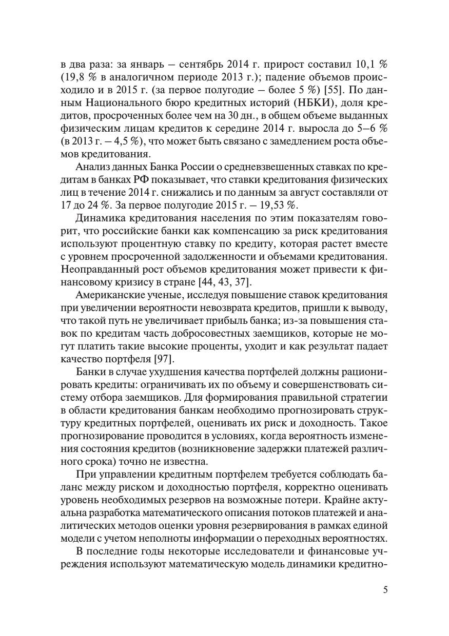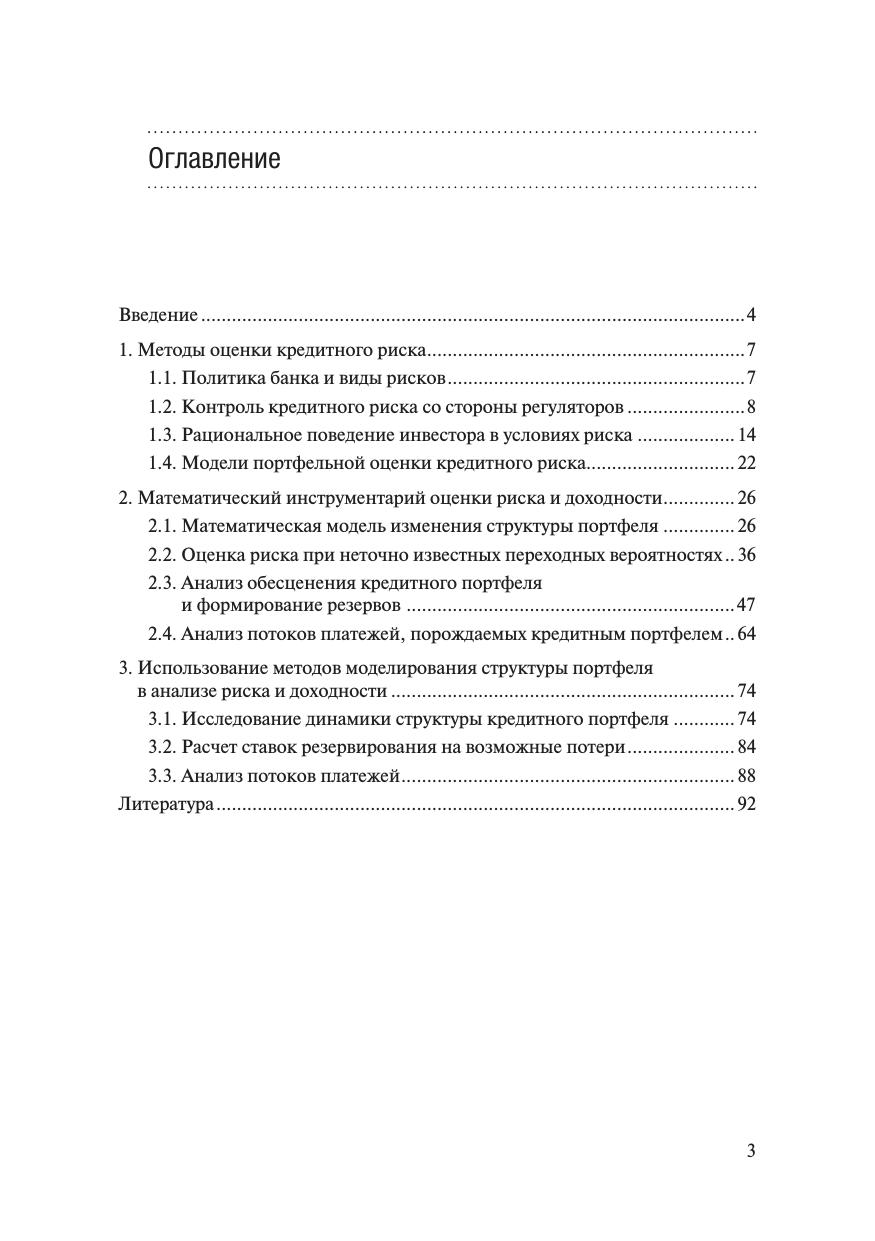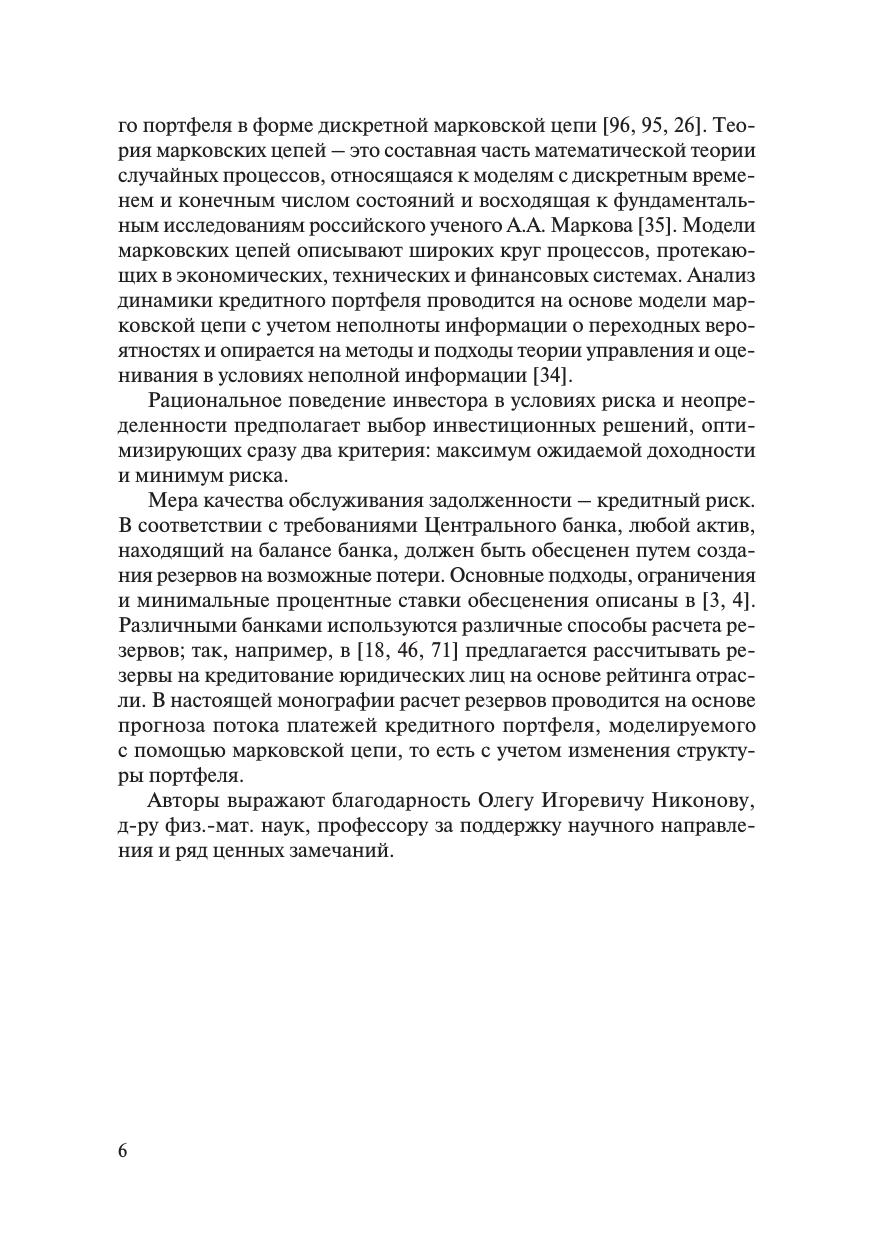 В монографии рассмотрены вопросы, связанные с математическим моделированием и прогнозированием динамики структуры кредитного портфеля. Предполагается, что портфель рассматривается как совокупность групп кредитов, объединенных по длительности просроченной задолженности. Под структурой портфеля понимается процентное соотношение групп в портфеле. Анализ динамики кредитного портфеля проводится на основе модели марковской цепи с учетом неполноты информации о переходных вероятностях и опирается на методы и подходы теории управления и оценивания в условиях неполной информации. Рассмотрены вопросы прогнозирования риска и доходности портфеля, расчета уровня необходимых резервов на основе прогнозирования структуры. Книга предназначена для научных работников, преподавателей, аспирантов, магистрантов и студентов, интересующихся проблемами финансового анализа и математического моделирования с использованием случайных процессов.