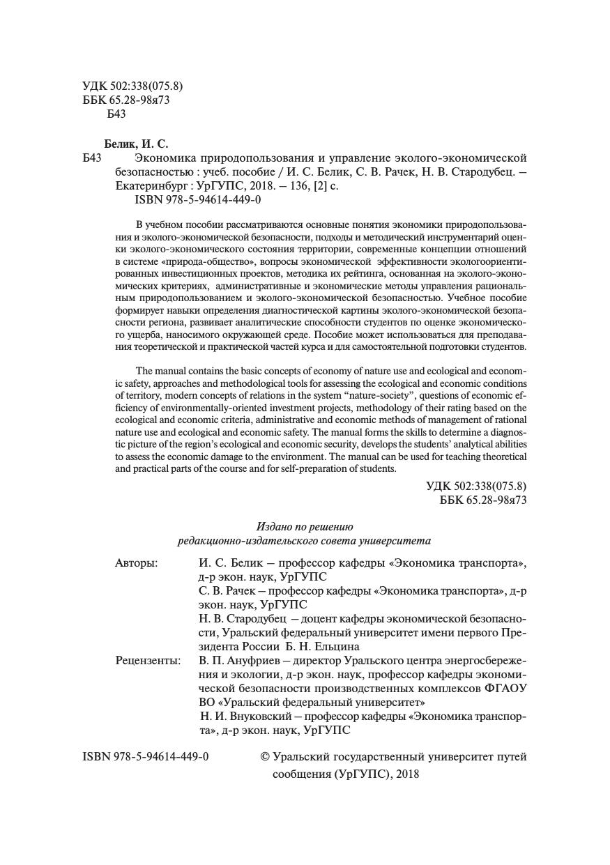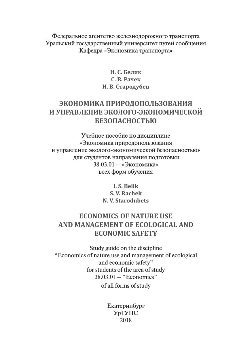 Белик, И.С. Экономика природопользования и управление эколого-экономической безопасностью : учебное пособие / С. В. Рачек, Н. В. Стародубец, И. С. Белик. — Екатеринбург : УрГУПС, 2018. — 136 с. — 978-5-94614-449-0. — Текст : электронный // УМЦ ЖДТ : электронная библиотека. — URL: https://umczdt.ru/books/1306/263300/ (дата обращения 09.11.2025). — Режим доступа: по подписке.