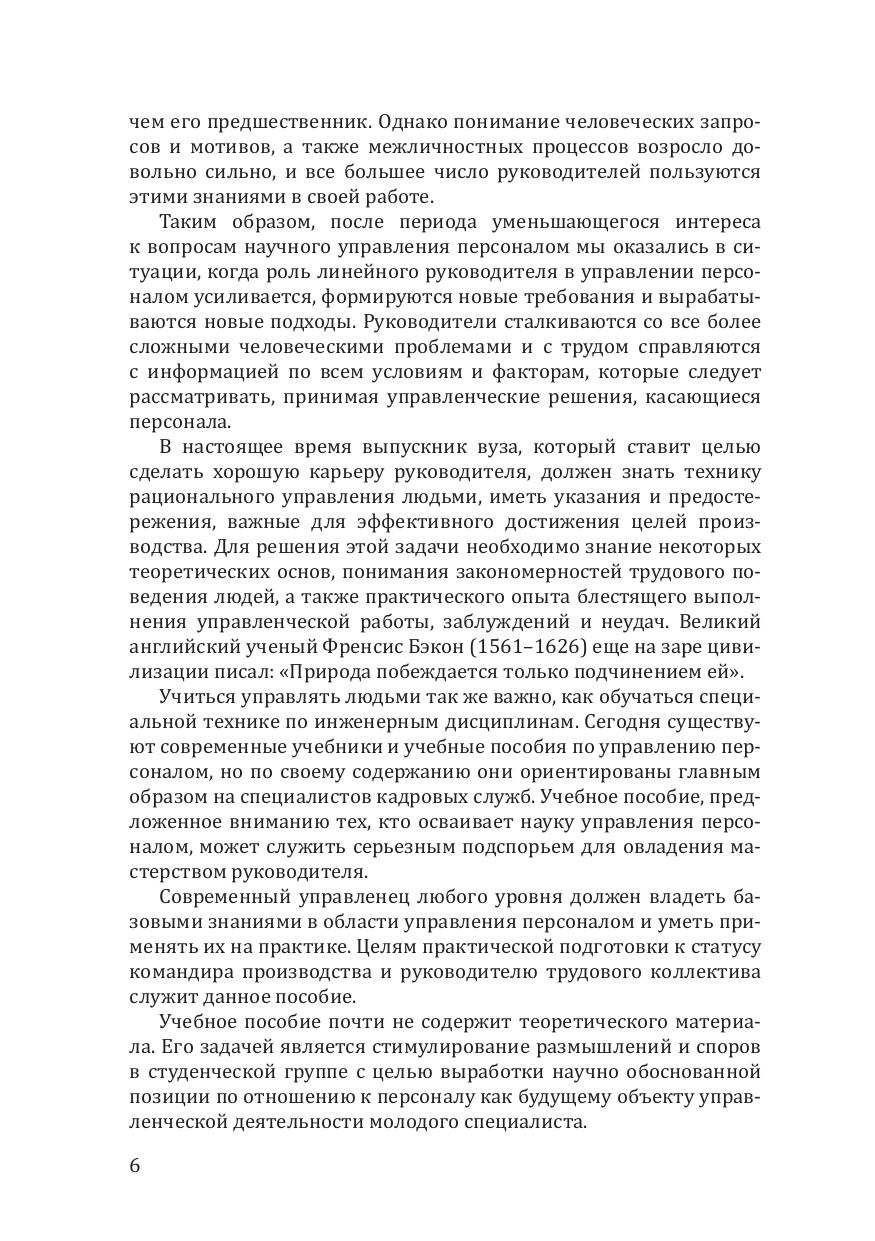 Учебное пособие по дисциплине «Управление персоналом», входящей в программу высшего профессионального образования будущих командиров производства, составлено на основании федеральных государственных образовательных стандартов соответствующих направлений профессиональной подготовки будущих руководителей. Учебное пособие дает краткое изложение теоретических закономерностей управления персоналом на производстве, а также материал, объясняющий поведение человека и группы в сфере труда, и предусматривает практическое освоение представленного материала. Каждая рассматриваемая тема содержит методический материал для самостоятельного изучения, ситуации для анализа, обсуждения и оценки в студенческой группе. Представлен материал для самостоятельной оценки с помощью специальных тестов, выявляющих особенности личности, готовности студентов к лидерскому статусу и управленческой деятельности. Материал дополняется большим иллюстративным материалом – таблицами и схемами, что помогает лучше понять изучаемый материал. Пособие адресовано студентам, аспирантам и преподавателям высших учебных заведений, а также руководителям любого уровня различ- ных учреждений и фирм.