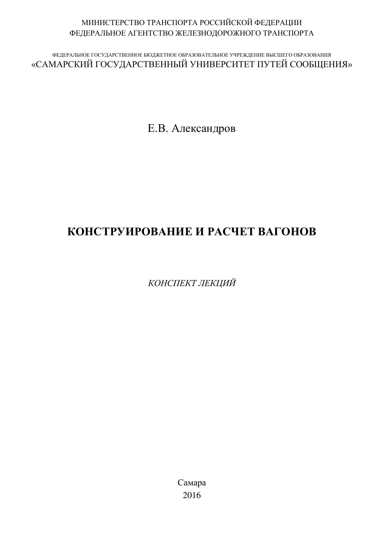 Александров, Е.В. Конструирование и расчет вагонов : конспект лекций / Е. В. Александров. — Самара : СамГУПС, 2016. — 54 с. — Текст : электронный // УМЦ ЖДТ : электронная библиотека. — URL: https://umczdt.ru/books/1311/263397/ (дата обращения 20.04.2026). — Режим доступа: по подписке.