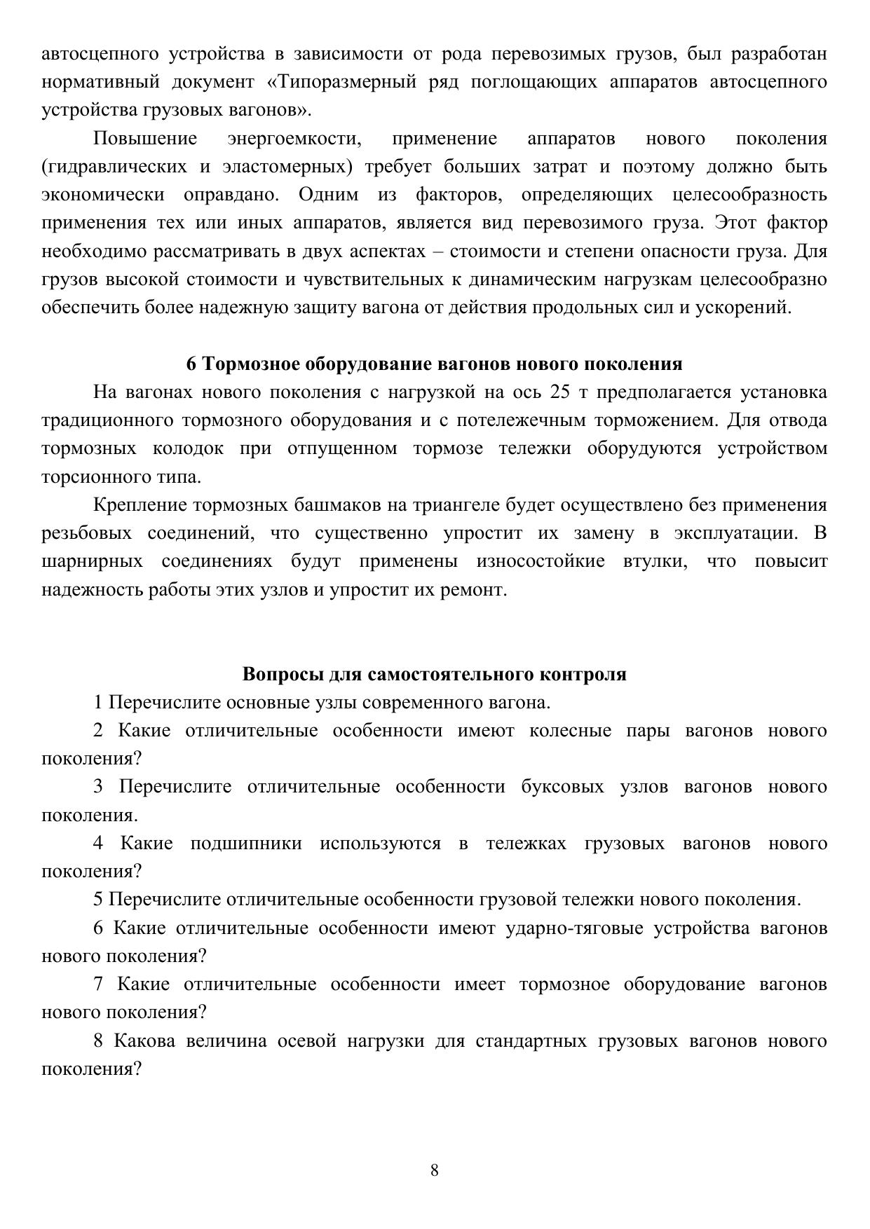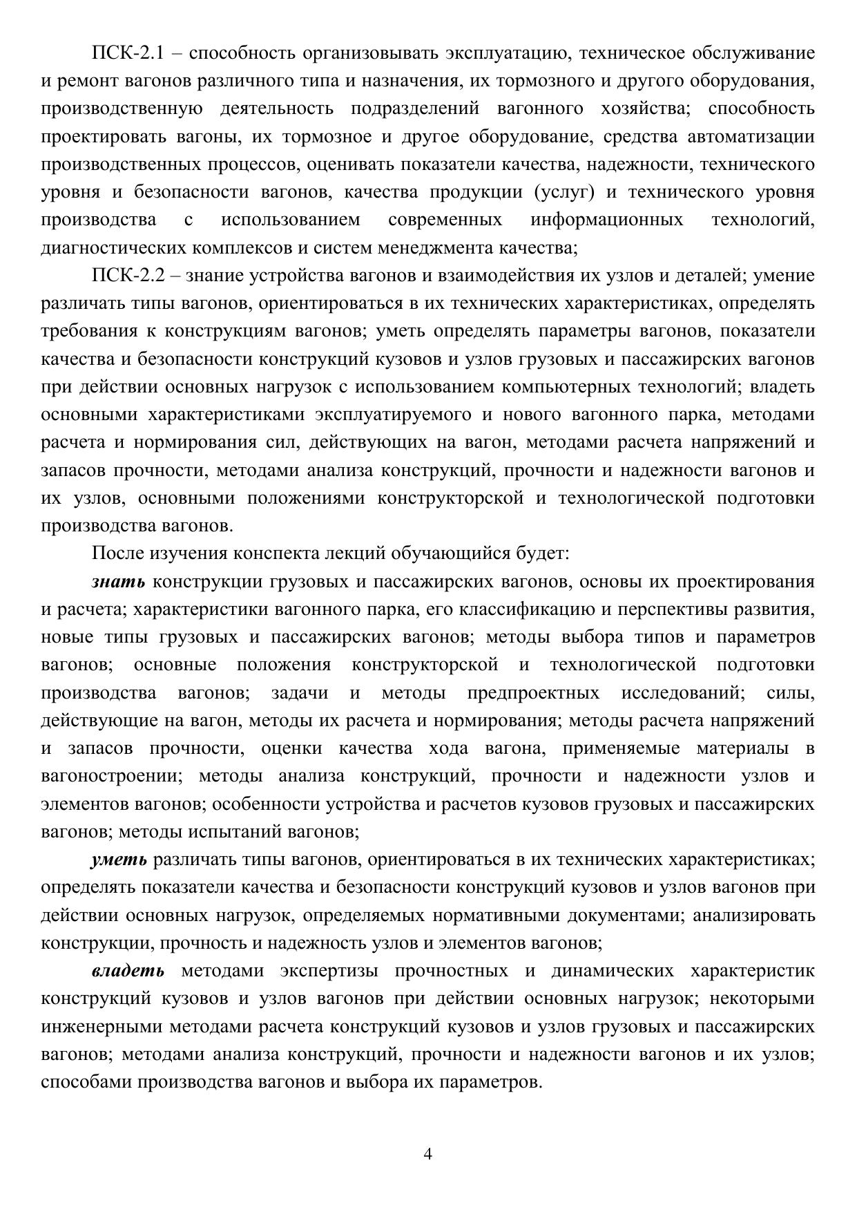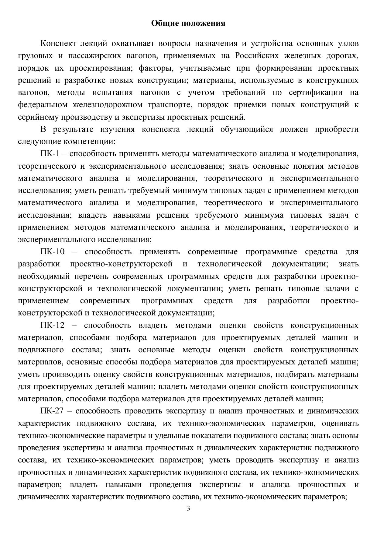 Конспект лекций предназначен для изучения теоретического материала по дисциплине «Конструирование и расчет вагонов», обучающимися по специальности 23.05.03 «Подвижной состав железных дорог», специализация № 2 «Вагоны» очной и заочной форм обучения.