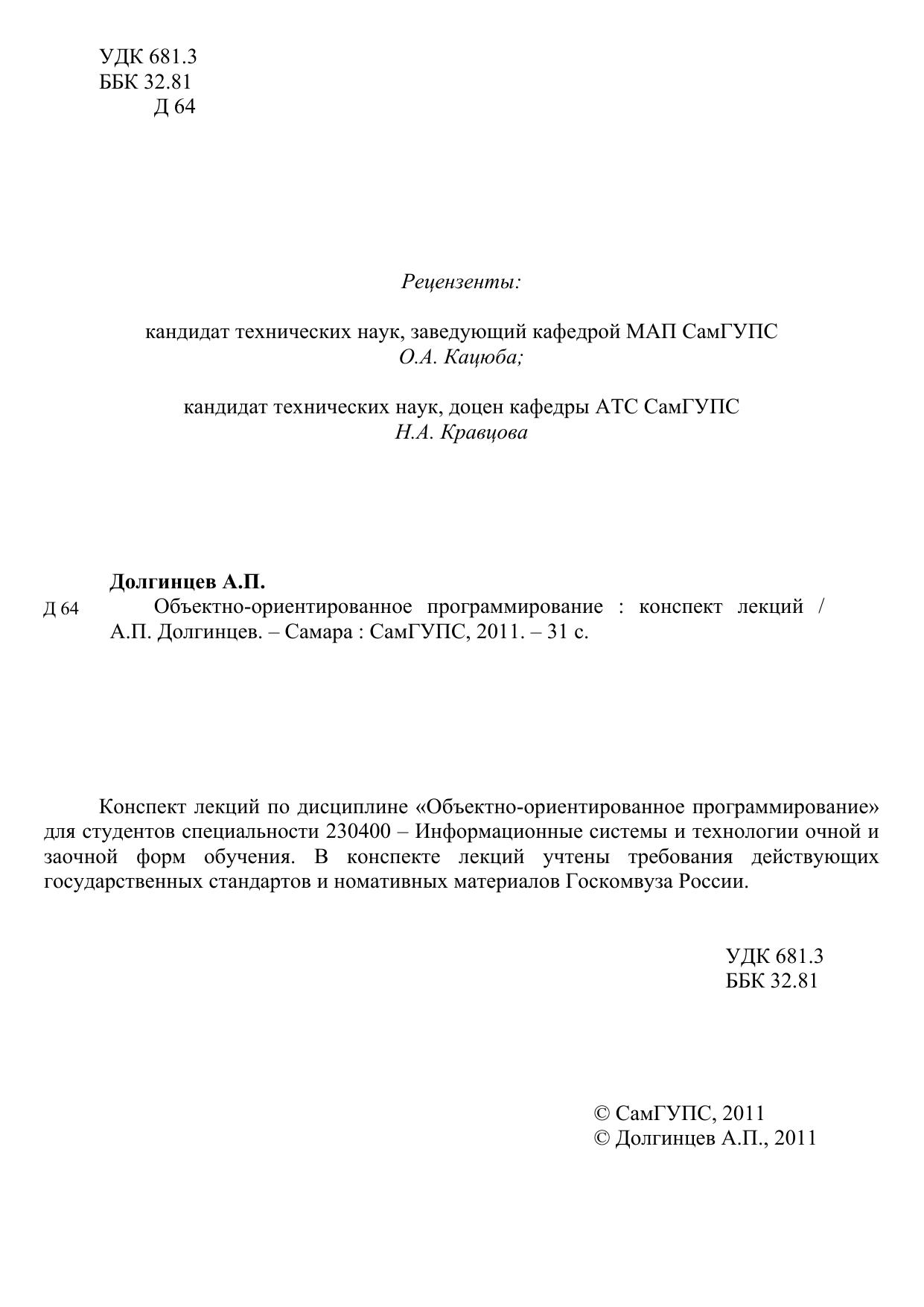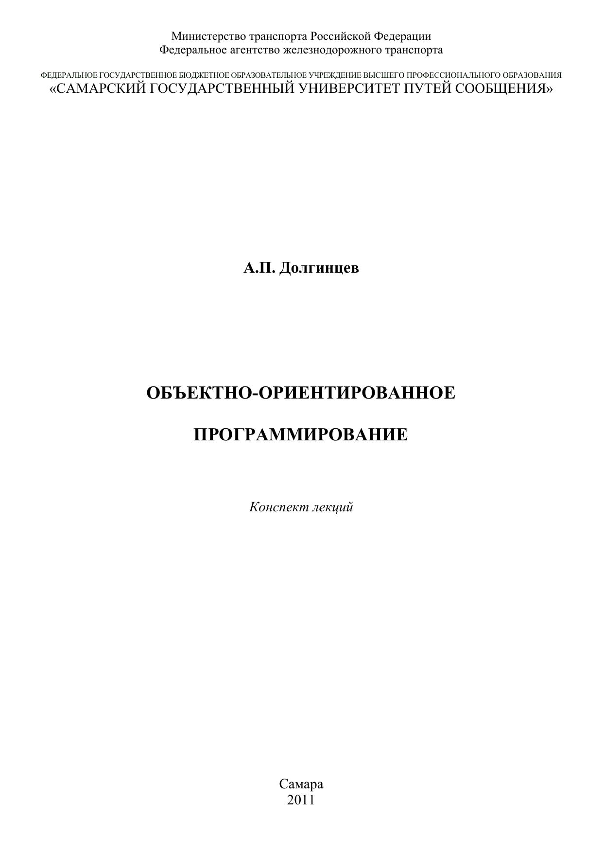 Долгинцев, А.П. Объектно-ориентированное программирование : конспект лекций / А. П. Долгинцев. — Самара : СамГУПС, 2011. — 31 с. — Текст : электронный // УМЦ ЖДТ : электронная библиотека. — URL: https://umczdt.ru/books/1311/263449/ (дата обращения 30.04.2026). — Режим доступа: по подписке.