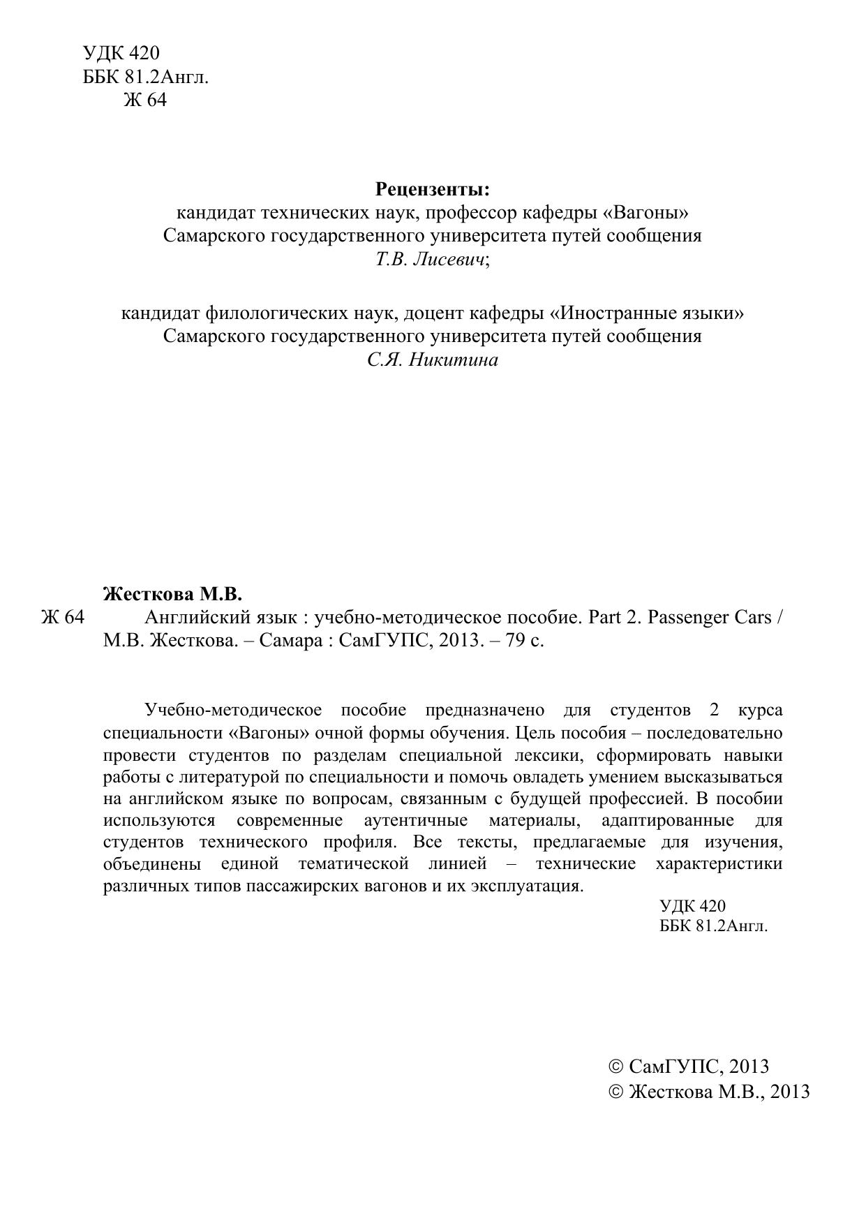 Жесткова, М.В. Английский язык. Часть 2. Passenger Cars : учебно-методическое пособие / М. В. Жесткова. — Самара : СамГУПС, 2013. — 79 с. — Текст : электронный // УМЦ ЖДТ : электронная библиотека. — URL: https://umczdt.ru/books/1311/263507/ (дата обращения 20.04.2026). — Режим доступа: по подписке.