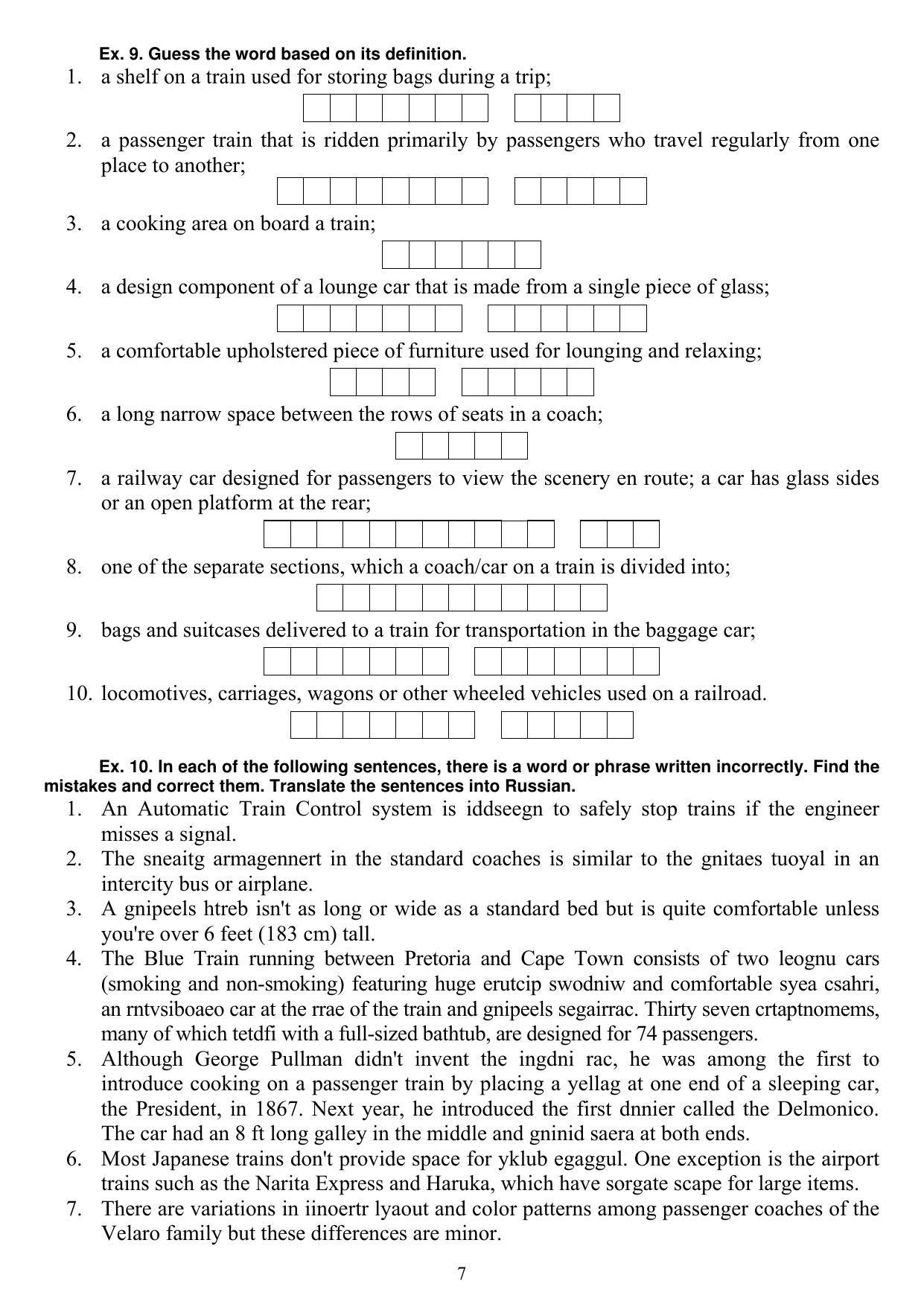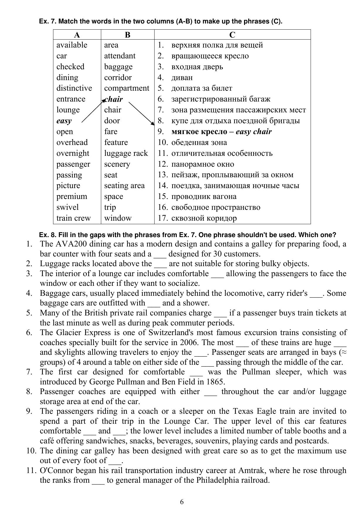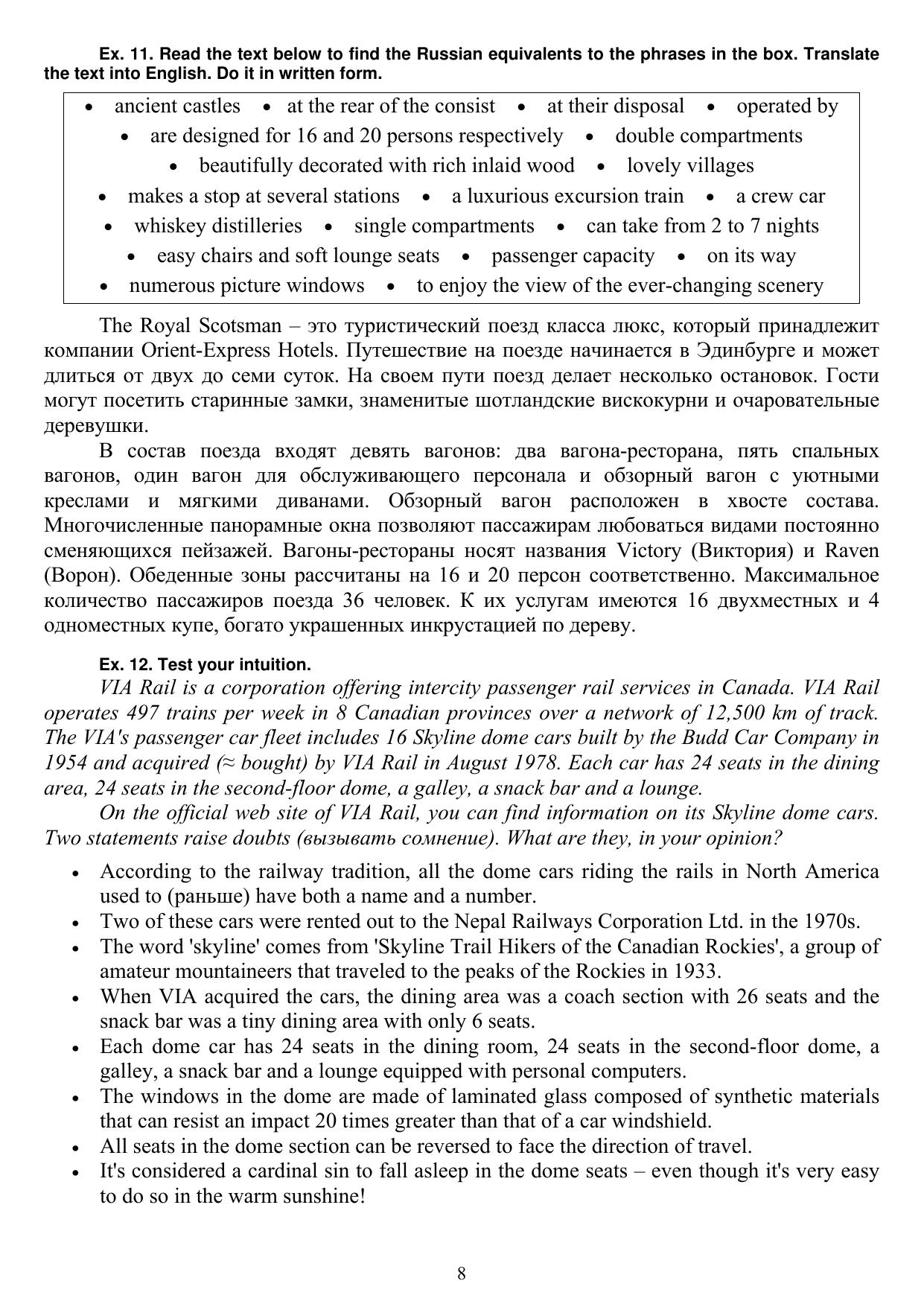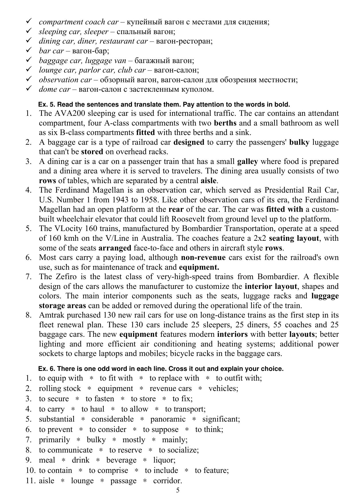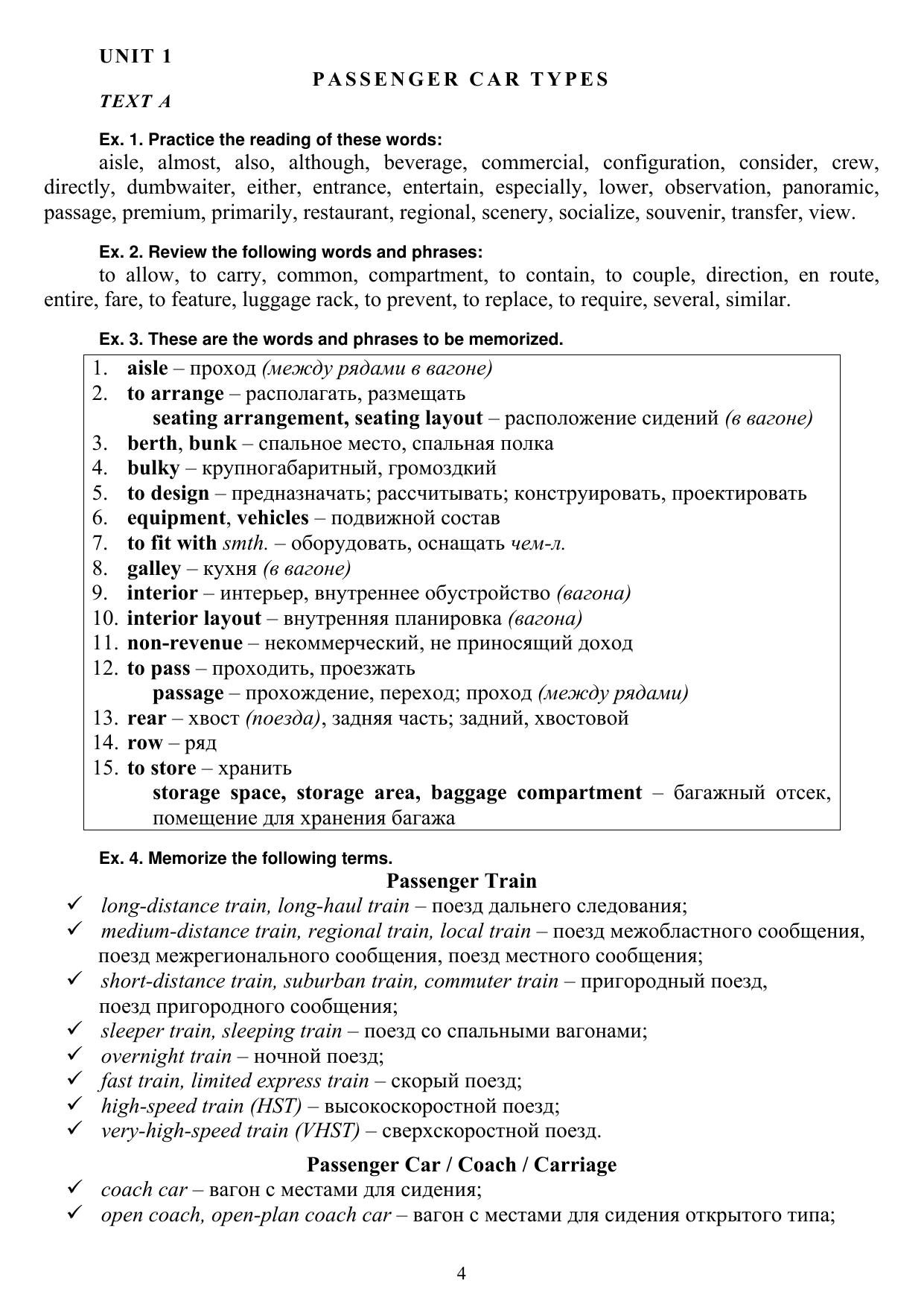 Учебно-методическое пособие предназначено для студентов 2 курса специальности «Вагоны» очной формы обучения. Цель пособия – последовательно провести студентов по разделам специальной лексики, сформировать навыки работы с литературой по специальности и помочь овладеть умением высказываться на английском языке по вопросам, связанным с будущей профессией. В пособии используются современные аутентичные материалы, адаптированные для студентов технического профиля. Все тексты, предлагаемые для изучения, объединены единой тематической линией – технические характеристики различных типов пассажирских вагонов и их эксплуатация.