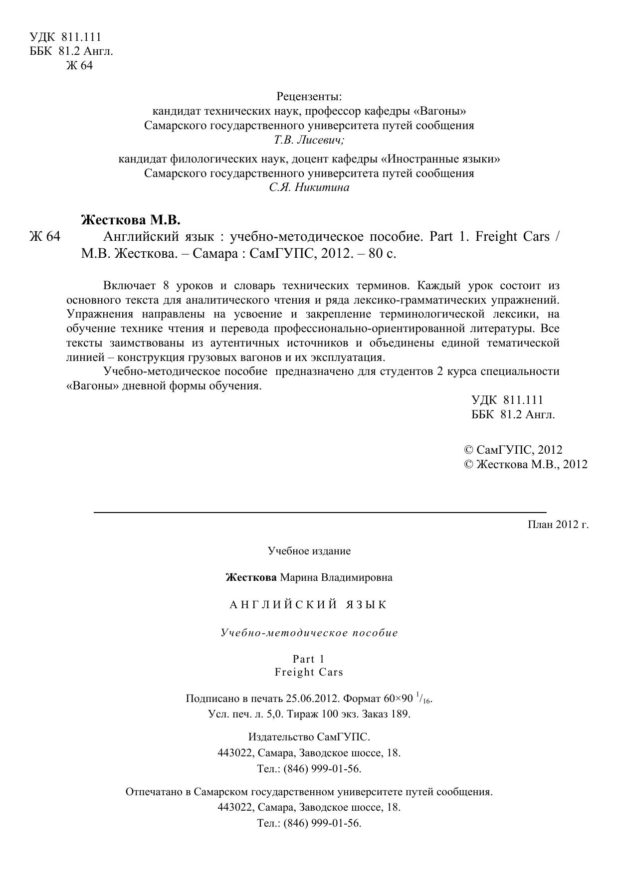 Жесткова, М.В. Английский язык. Часть 1. Freight Cars : учебно-методическое пособие / М. В. Жесткова. — Самара : СамГУПС, 2012. — 80 с. — Текст : электронный // УМЦ ЖДТ : электронная библиотека. — URL: https://umczdt.ru/books/1311/263510/ (дата обращения 20.04.2026). — Режим доступа: по подписке.