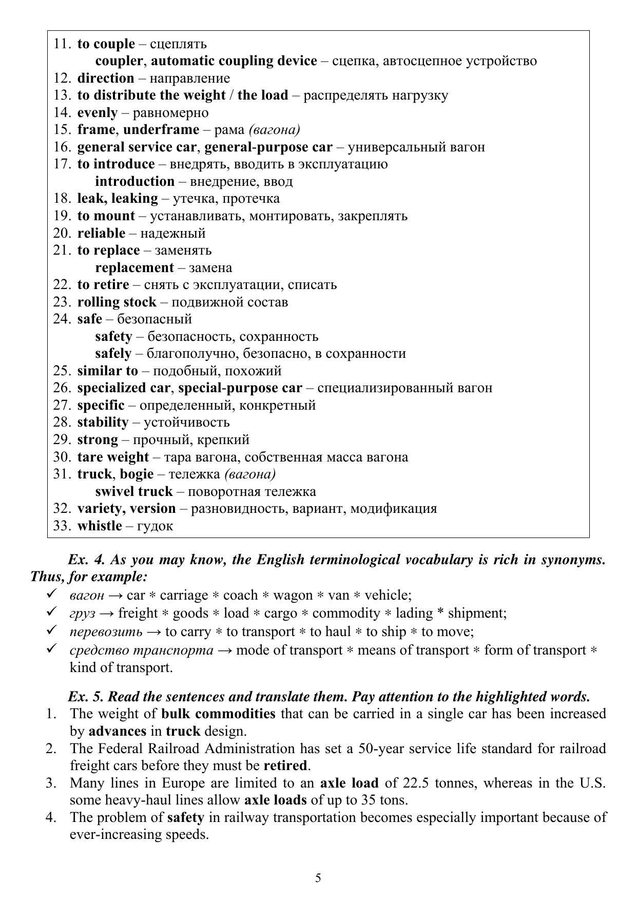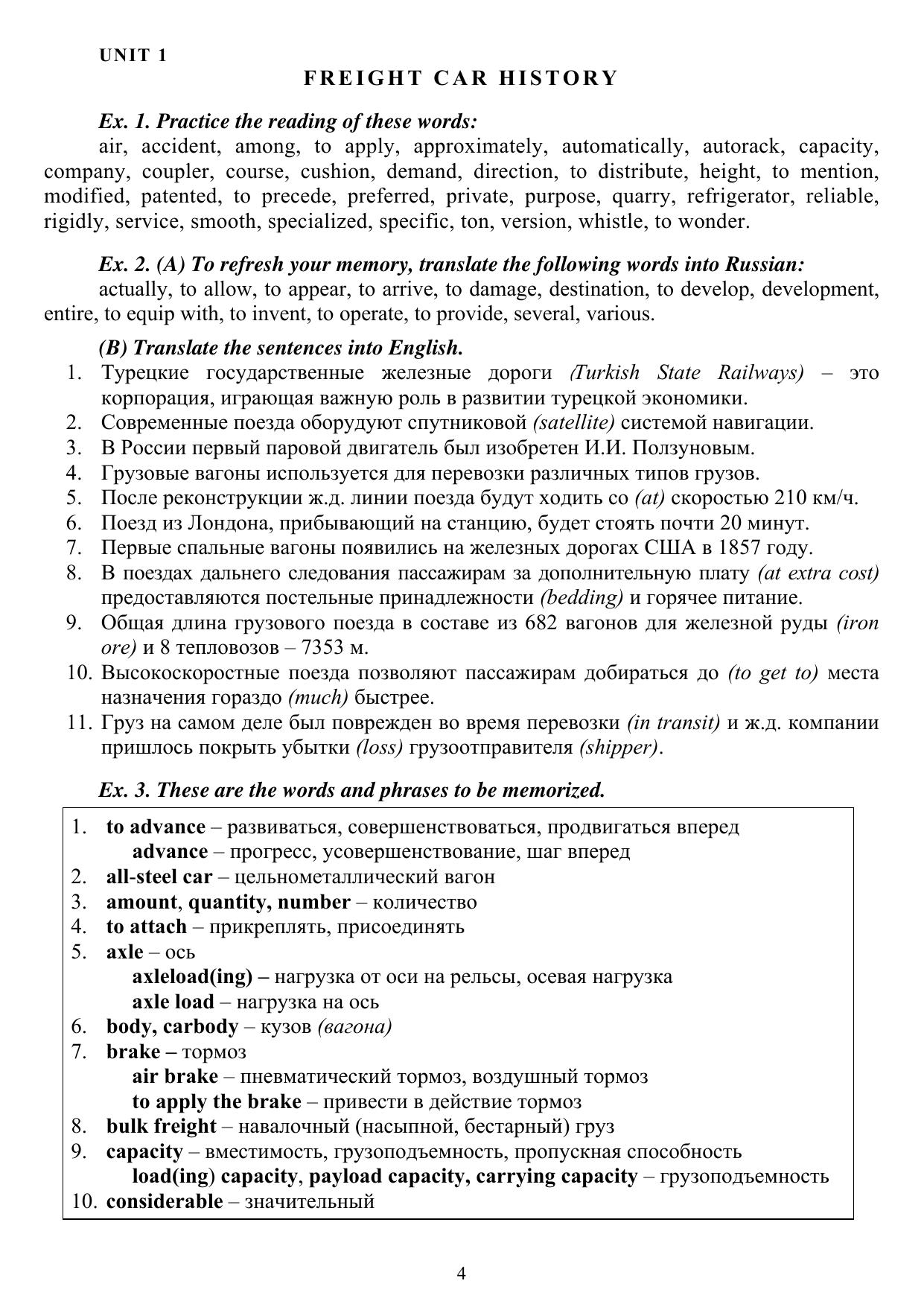 Включает 8 уроков и словарь технических терминов. Каждый урок состоит из основного текста для аналитического чтения и ряда лексико-грамматических упражнений. Упражнения направлены на усвоение и закрепление терминологической лексики, на обучение технике чтения и перевода профессионально-ориентированной литературы. Все тексты заимствованы из аутентичных источников и объединены единой тематической линией – конструкция грузовых вагонов и их эксплуатация. Учебно-методическое пособие предназначено для студентов 2 курса специальности «Вагоны» дневной формы обучения.