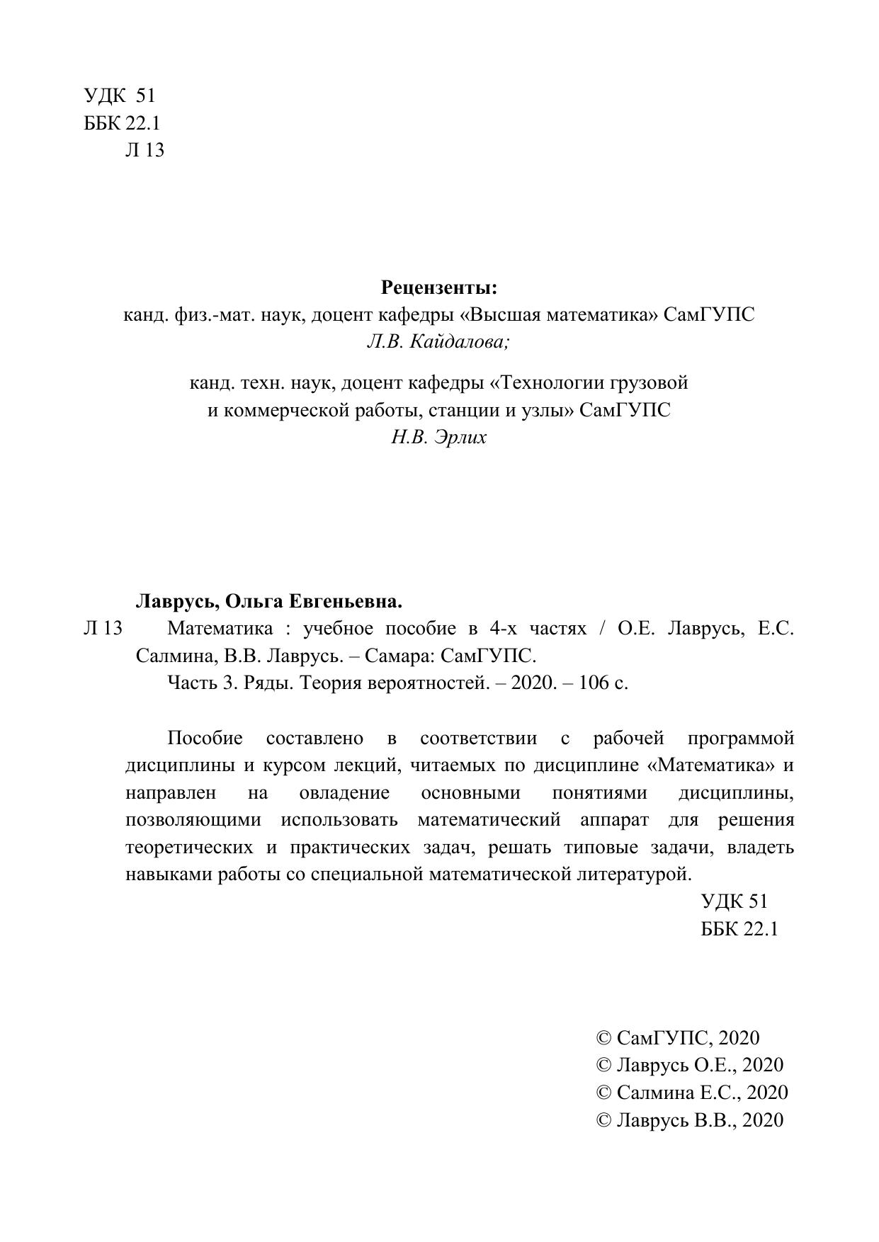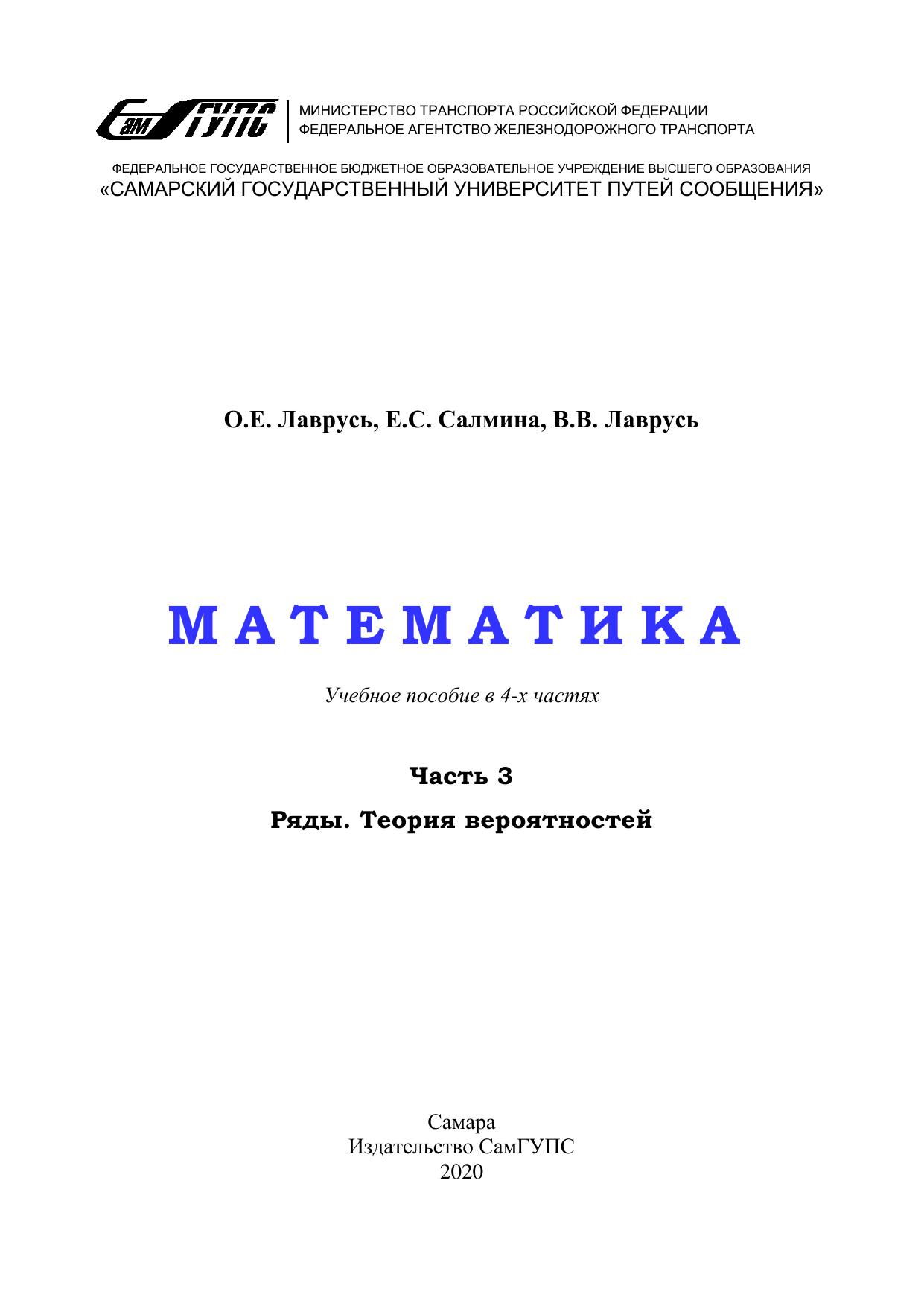Лаврусь, О.Е. Математика. Часть 3. Ряды. Теория вероятностей : учебное пособие / О. Е. Лаврусь, Е. С. Салмина, В. В. Лаврусь. — Самара : СамГУПС, 2020. — 106 с. — Текст : электронный // УМЦ ЖДТ : электронная библиотека. — URL: https://umczdt.ru/books/1311/263539/ (дата обращения 07.12.2025). — Режим доступа: по подписке.