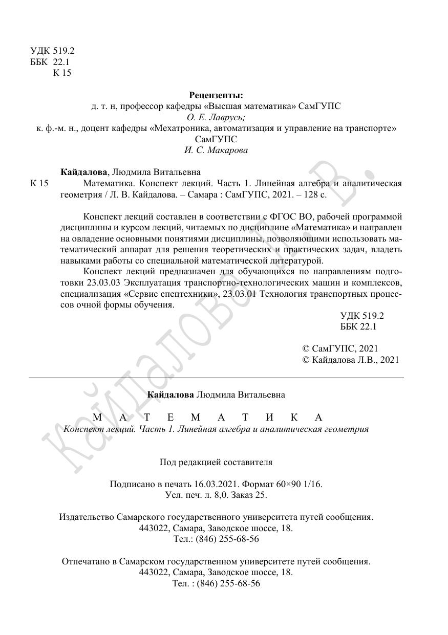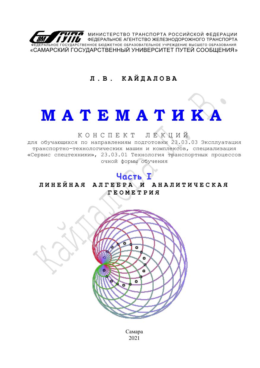 Кайдалова, Л.В. Математика. Часть 1. Линейная алгебра и аналитическая геометрия : конспект лекций / Л. В. Кайдалова. — Самара : СамГУПС, 2021. — 128 с. — Текст : электронный // УМЦ ЖДТ : электронная библиотека. — URL: https://umczdt.ru/books/1311/263580/ (дата обращения 14.01.2026). — Режим доступа: по подписке.