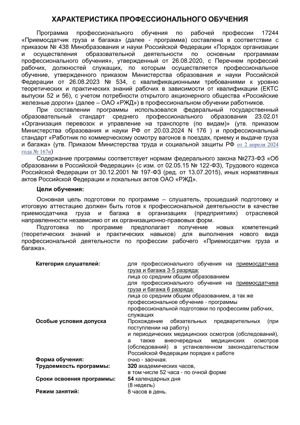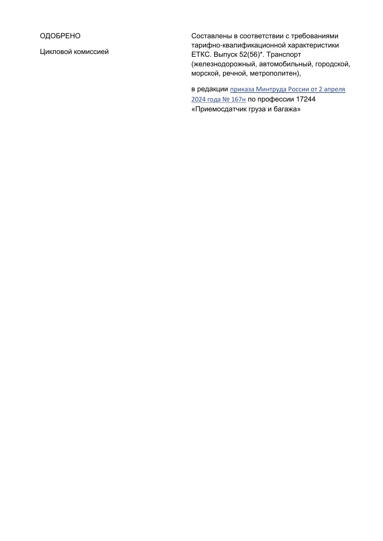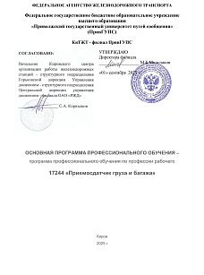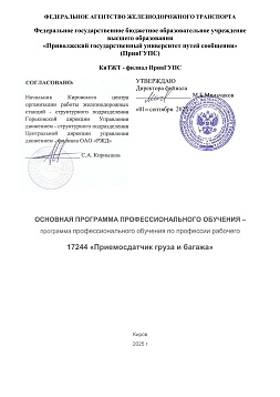Приемосдатчик груза и багажа : программа профессиональной подготовки / . — Киров : КиТЖТ - филиал ПривГУПС, 2025. — 96 с. — Текст : электронный // УМЦ ЖДТ : электронная библиотека. — URL: https://umczdt.ru/books/1311/299844/ (дата обращения 18.04.2026). — Режим доступа: по подписке.