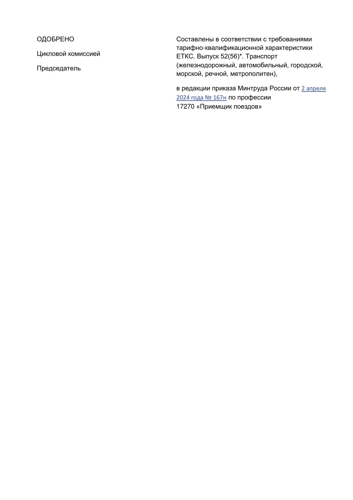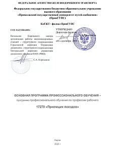 Приемщик поездов : программа профессиональной подготовки / . — Киров : КиТЖТ - филиал ПривГУПС, 2025. — 74 с. — Текст : электронный // УМЦ ЖДТ : электронная библиотека. — URL: https://umczdt.ru/books/1311/299847/ (дата обращения 18.04.2026). — Режим доступа: по подписке.