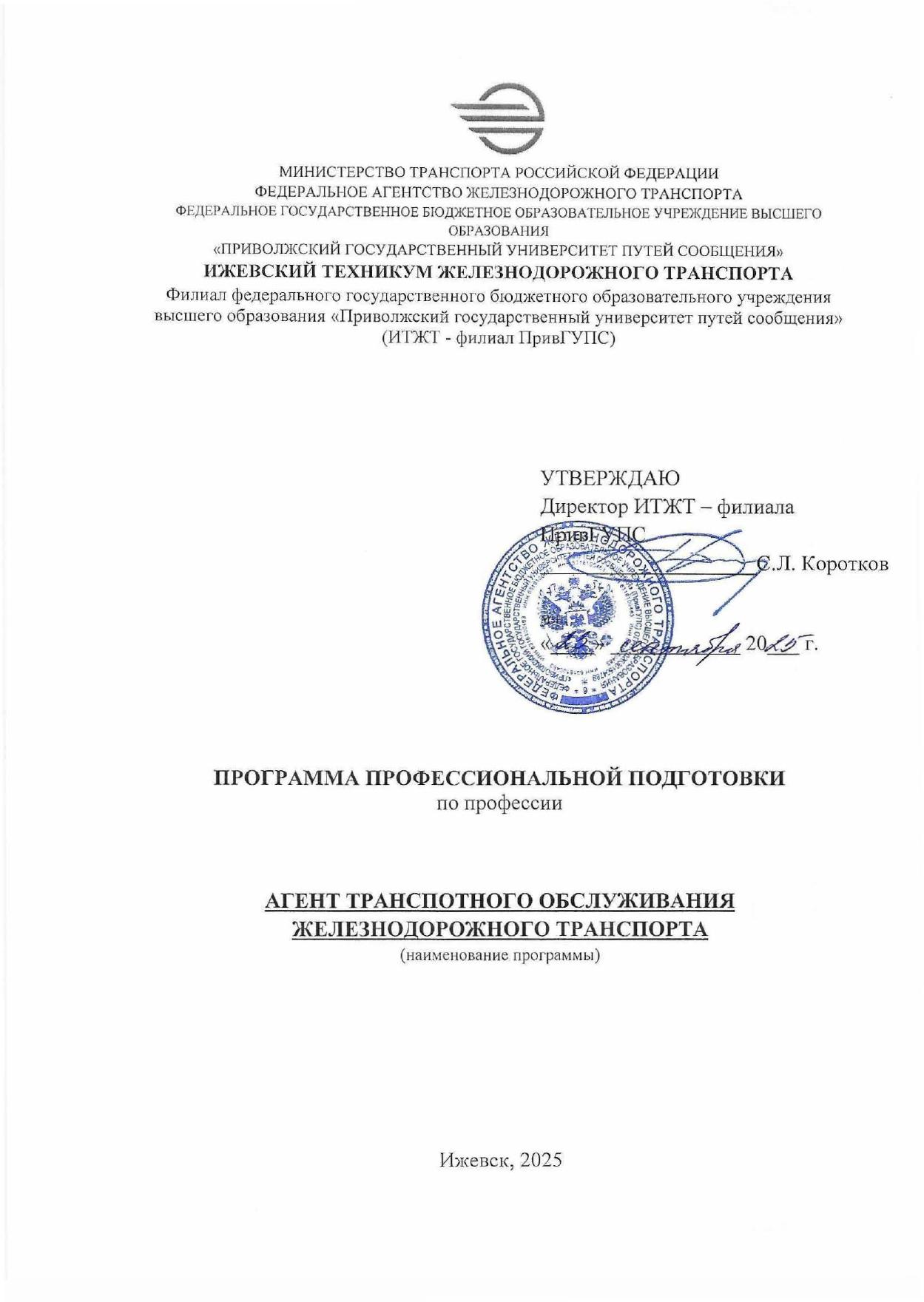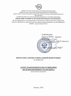 Агент транспортного обслуживания железнодорожного транспорта : программа профессиональной подготовки / . — Ижевск : ИТЖТ-филиал ПривГУПС, 2025. — 31 с. — Текст : электронный // УМЦ ЖДТ : электронная библиотека. — URL: https://umczdt.ru/books/1311/299872/ (дата обращения 17.04.2026). — Режим доступа: по подписке.