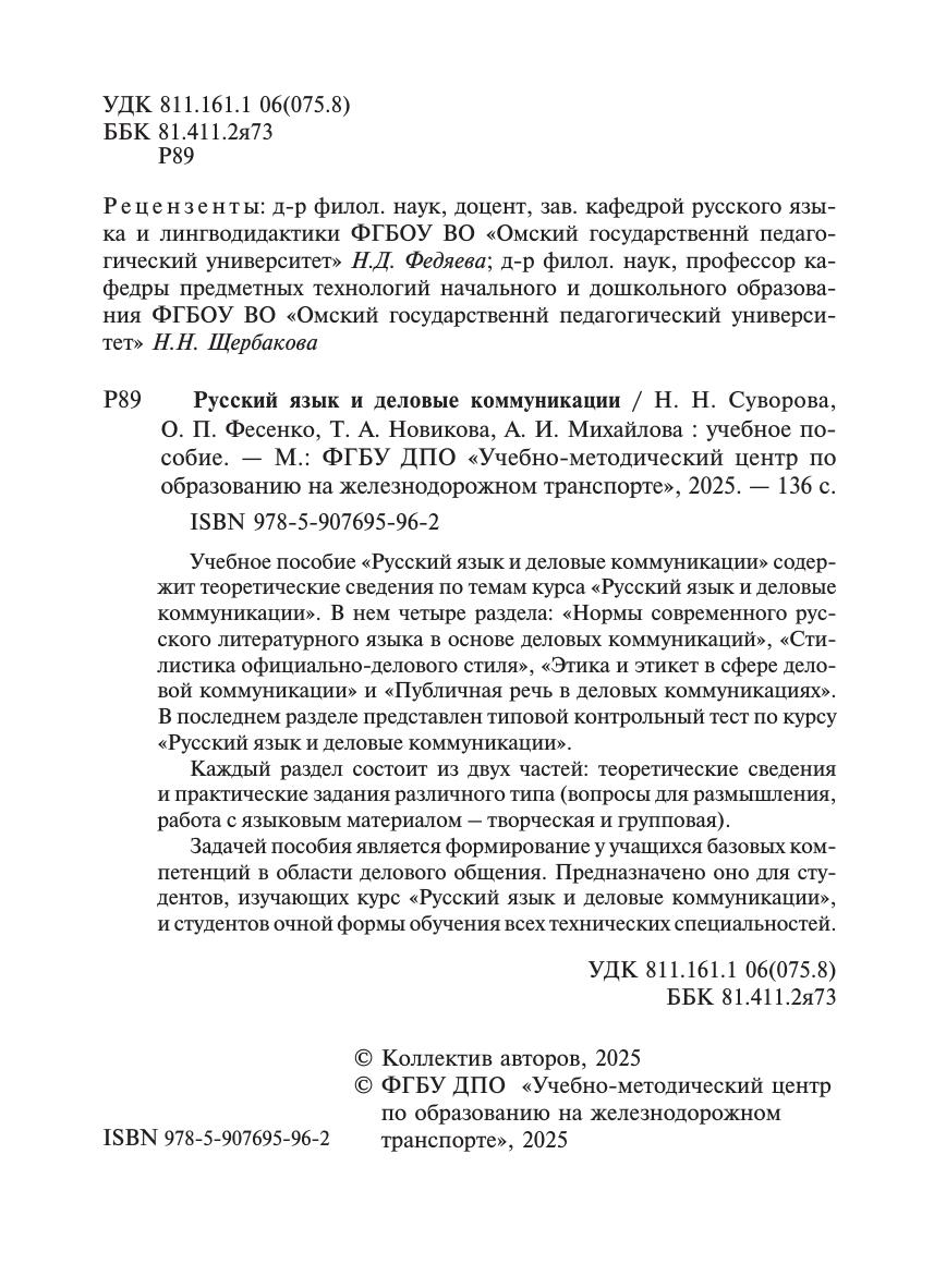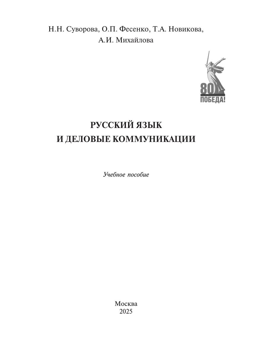 Суворова, Н.Н. Русский язык и деловые коммуникации : учебное пособие / Н. Н. Суворова, О. П. Фесенко, Т. А. Новикова, А. И. Михайлова. — Москва : УМЦ ЖДТ, 2025. — 134 с. — 978-5-907695-96-2. — Текст : электронный // УМЦ ЖДТ : электронная библиотека. — URL: https://umczdt.ru/books/1216/296813/ (дата обращения 29.04.2026). — Режим доступа: по подписке.