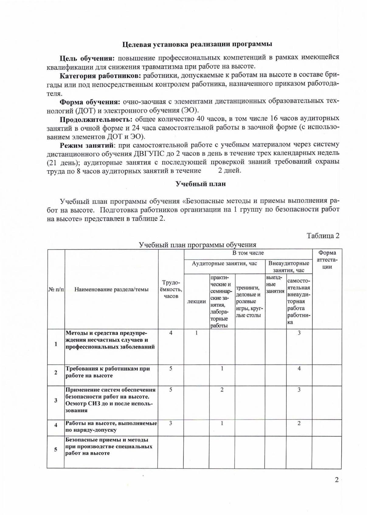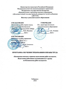 Категории слушателей: работники, допускаемые к работам на высоте в составе бригады или под непосредственным контролем работника, назначенного приказом работодателя. Форма обучения: очно-заочная, 40 часов. Ссылка на программу на сайте разработчика: https://ido-dvgups.ru/courses/bezopasnye-metody-i-priemy-vypolneniya-rabot-na-vysote-podgotovka-rabotnikov-organizaczii-na-1-gruppu-po-bezopasnosti-rabot-na-vysote
