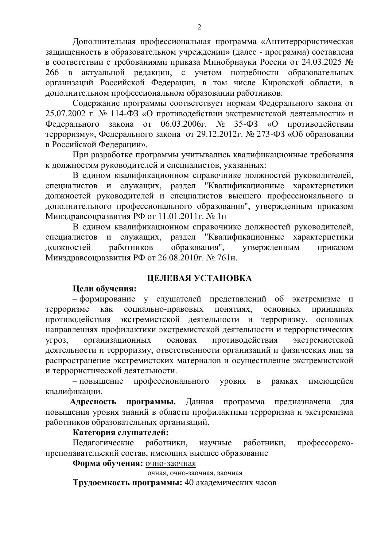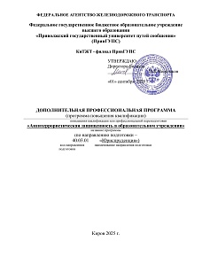 Антитеррористическая защищенность в образовательном учреждении : программа повышения квалификации / . — Киров : КиТЖТ - филиал ПривГУПС, 2025. — 23 с. — Текст : электронный // УМЦ ЖДТ : электронная библиотека. — URL: https://umczdt.ru/books/1311/299857/ (дата обращения 18.04.2026). — Режим доступа: по подписке.