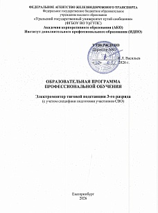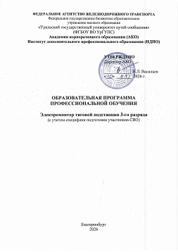 Электро-монтер тяговой подстанции 3-го разряда : программа профессиональной подготовки / . — Екатеринбург : УрГУПС, 2026. — 45 с. — Текст : электронный // УМЦ ЖДТ : электронная библиотека. — URL: https://umczdt.ru/books/1306/299877/ (дата обращения 15.04.2026). — Режим доступа: по подписке.