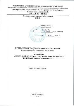 Дежурный по комнате отдыха пассажиров на железнодорожном вокзале : программа профессиональной подготовки / . — Санкт-Петербург : ПГУПС, 2026. — 16 с. — Текст : электронный // УМЦ ЖДТ : электронная библиотека. — URL: https://umczdt.ru/books/1283/299906/ (дата обращения 15.04.2026). — Режим доступа: по подписке.