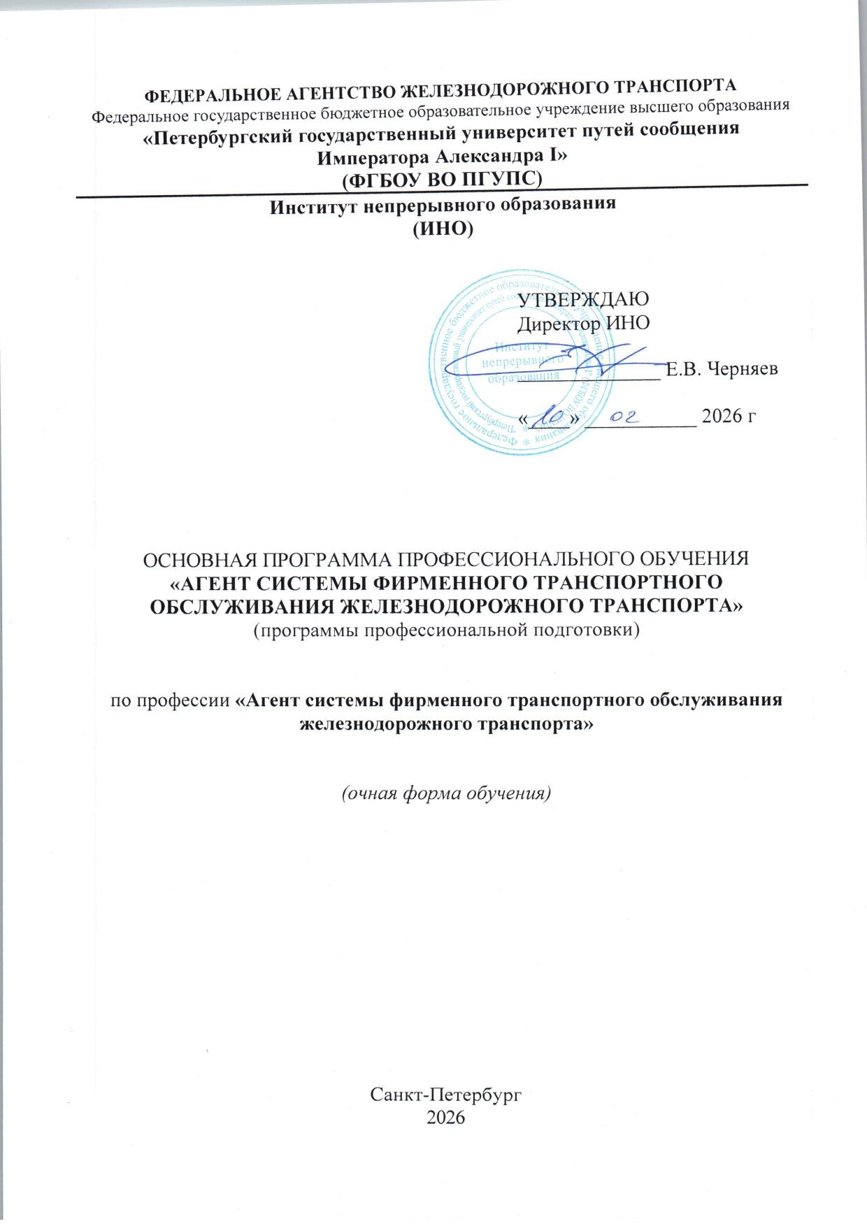 Агент системы фирменного транспортного обслуживания : программа профессиональной подготовки / . — Санкт-Петербург : ПГУПС, 2026. — 30 с. — Текст : электронный // УМЦ ЖДТ : электронная библиотека. — URL: https://umczdt.ru/books/1283/299908/ (дата обращения 15.04.2026). — Режим доступа: по подписке.