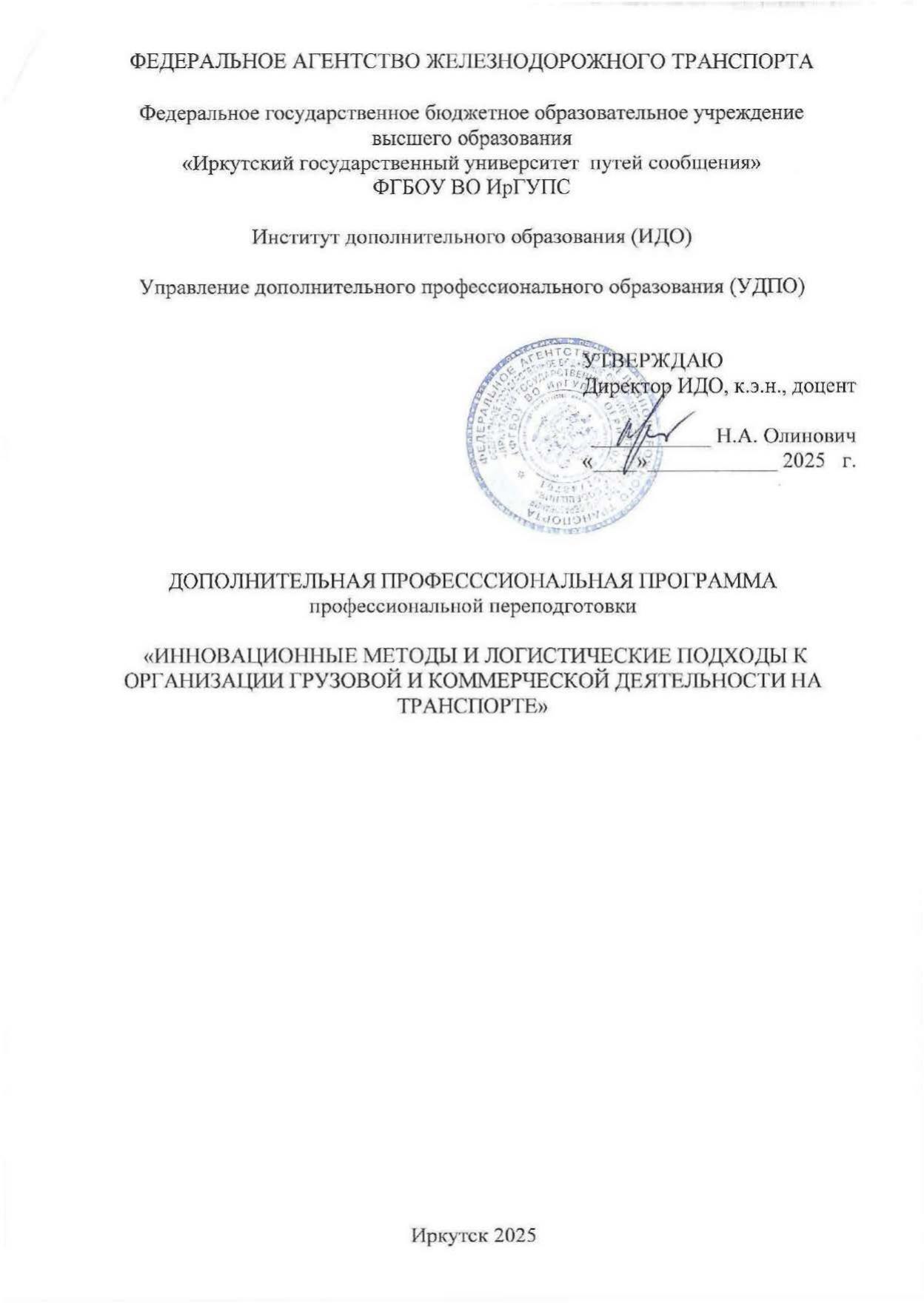 Инновационные методы и логистические подходы к организации грузовой и коммерческой деятельности на транспорте : программа профессиональной переподготовки / . — Иркутск : ИрГУПС, 2025. — 32 с. — Текст : электронный // УМЦ ЖДТ : электронная библиотека. — URL: https://umczdt.ru/books/1388/299703/ (дата обращения 17.04.2026). — Режим доступа: по подписке.