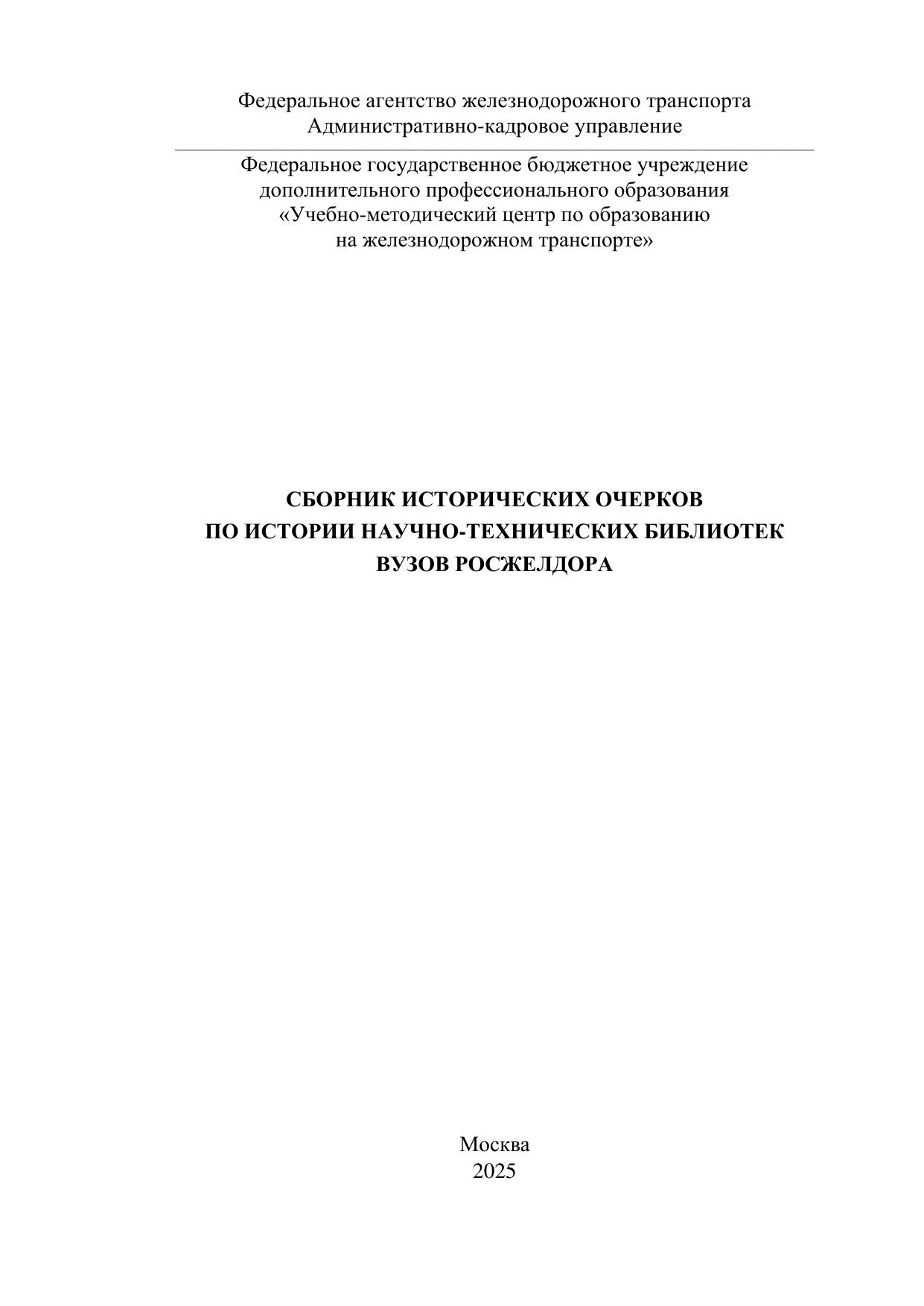 Сборник исторических очерков по истории научно-технических библиотек ВУЗов Росжелдора : сборник / . — Москва : УМЦ ЖДТ, 2025. — 113 с. — Текст : электронный // УМЦ ЖДТ : электронная библиотека. — URL: https://umczdt.ru/books/972/296885/ (дата обращения 21.01.2026). — Режим доступа: по подписке.