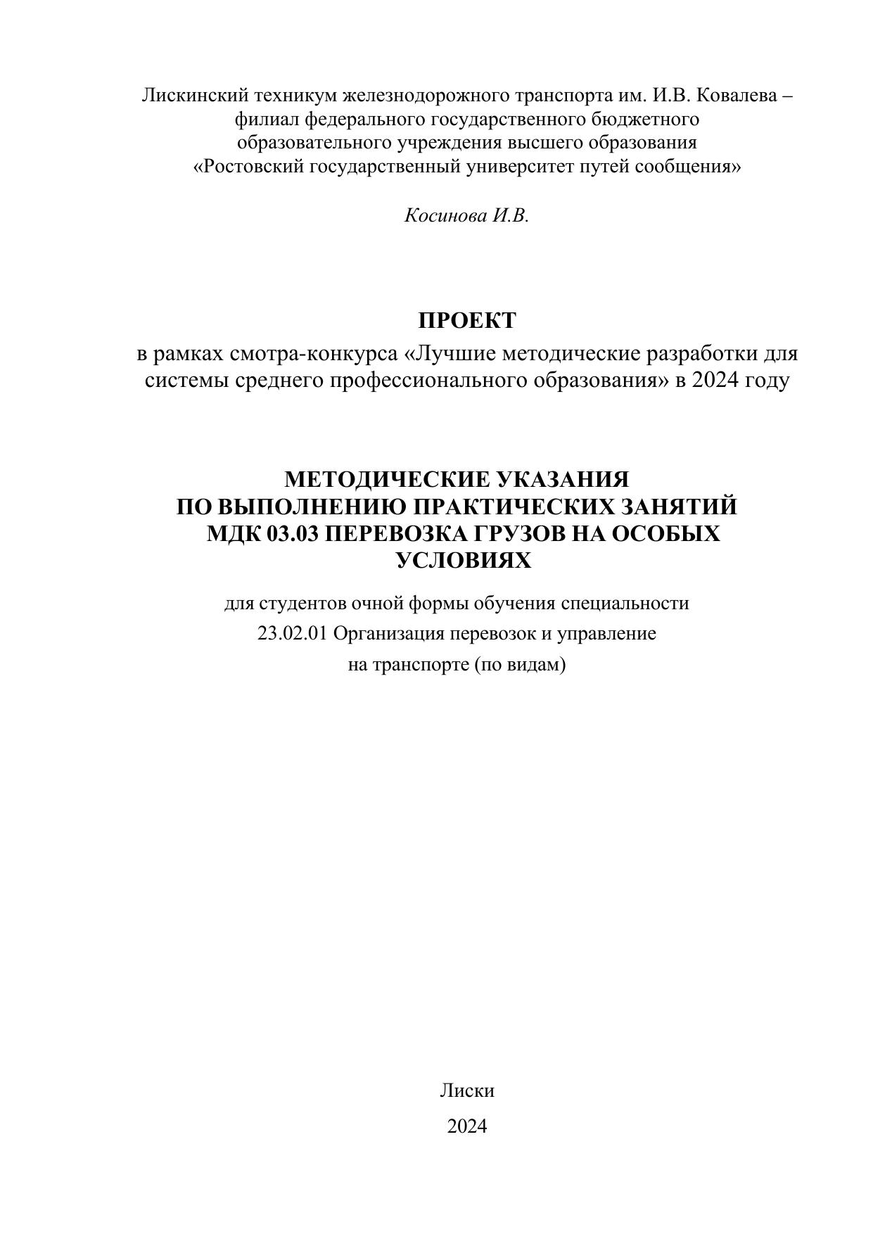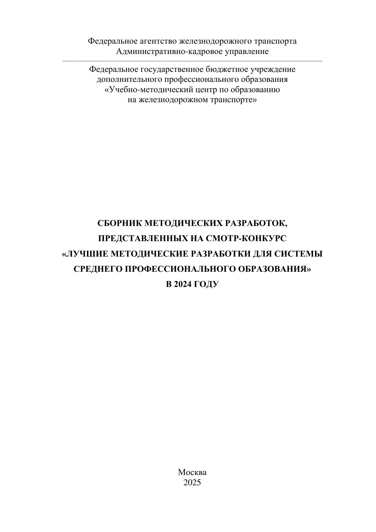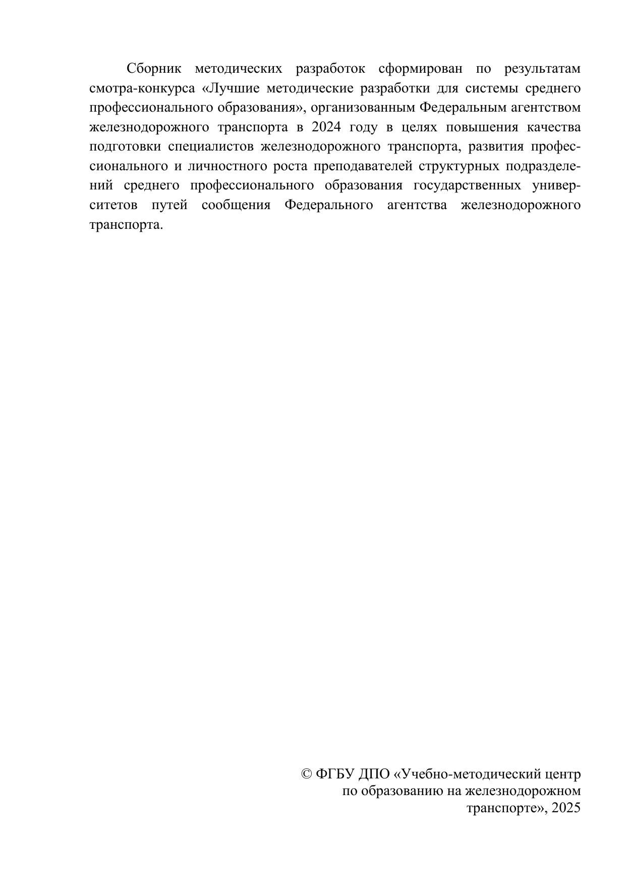 Сборник методических разработок сформирован по результатам смотра-конкурса «Лучшие методические разработки для системы среднего профессионального образования», организованным Федеральным агентством железнодорожного транспорта в 2024 году в целях повышения качества подготовки специалистов железнодорожного транспорта, развития профес- сионального и личностного роста преподавателей структурных подразделе- ний среднего профессионального образования государственных универ- ситетов путей сообщения Федерального агентства железнодорожного транспорта.