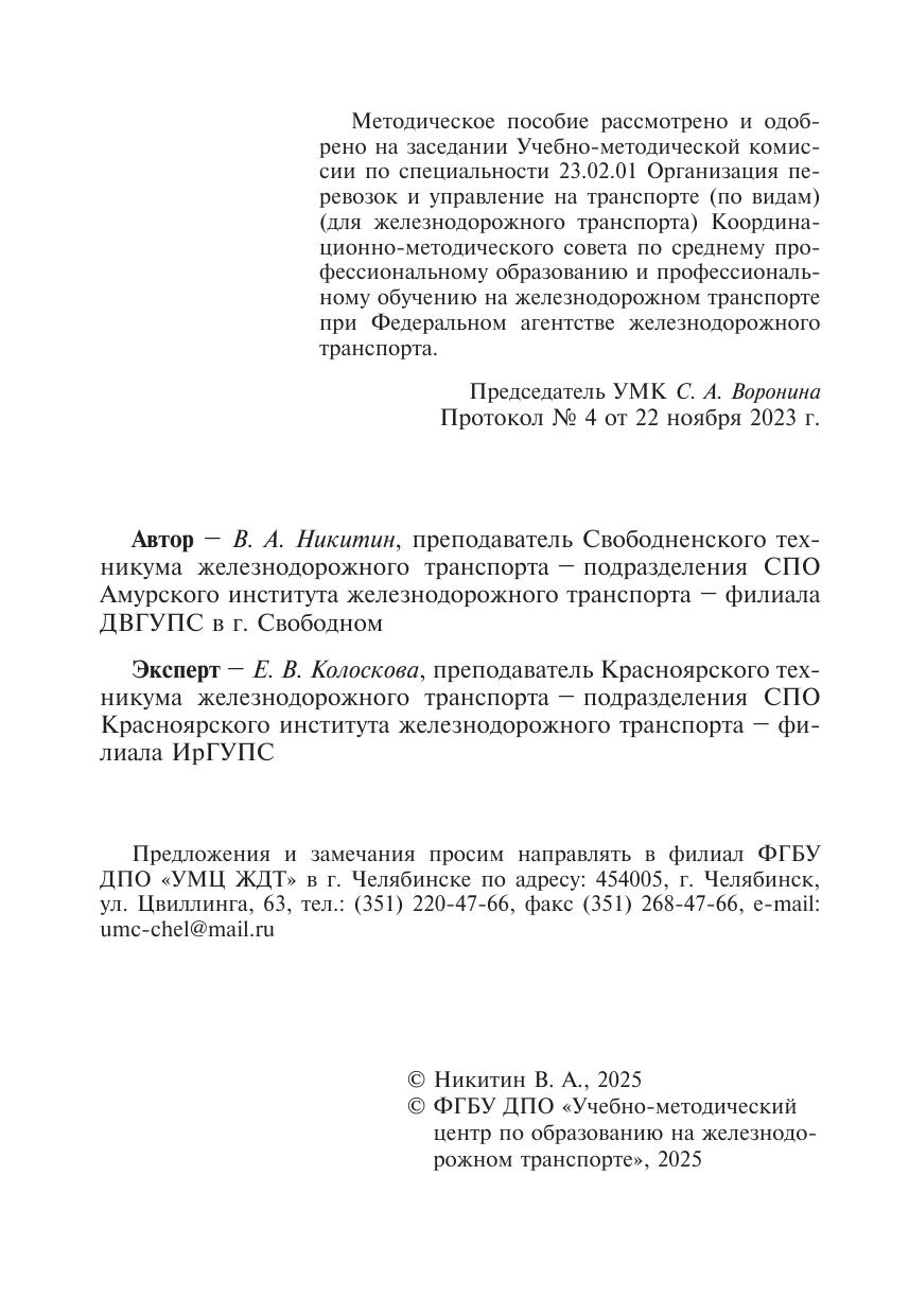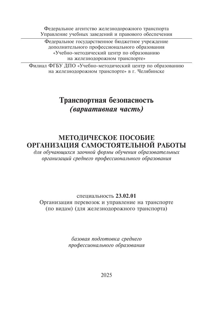 Никитин, В.А. Методическое пособие Организация самостоятельной работы для обучающихся заочной формы обучения образовательных организаций среднего профессионального образования Транспортная безопасность (вариативная часть) : методическое пособие / В. А. Никитин. — Москва : УМЦ ЖДТ, 2025. — 100 с. — Текст : электронный // УМЦ ЖДТ : электронная библиотека. — URL: https://umczdt.ru/books/1258/296666/ (дата обращения 08.02.2026). — Режим доступа: по подписке.