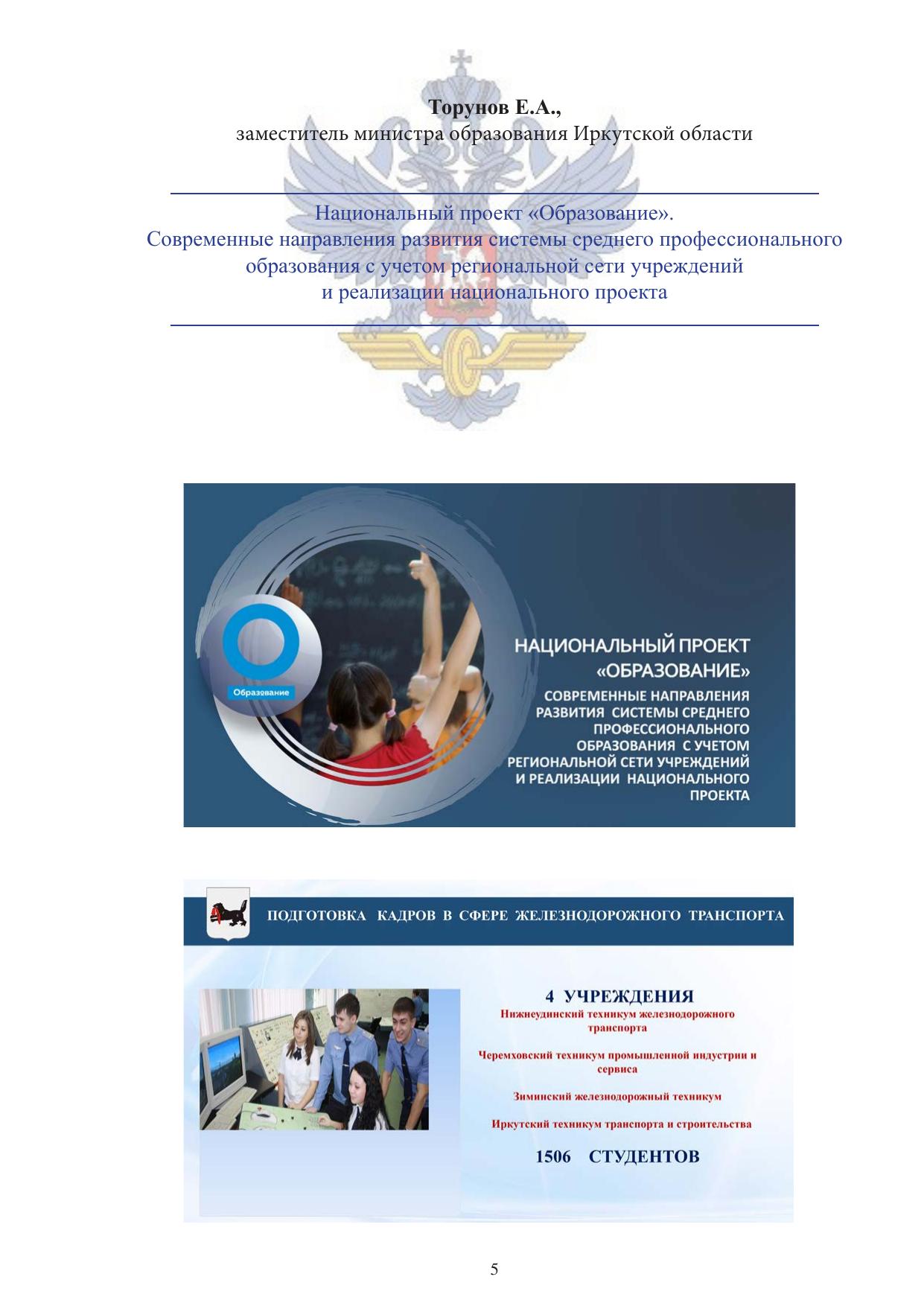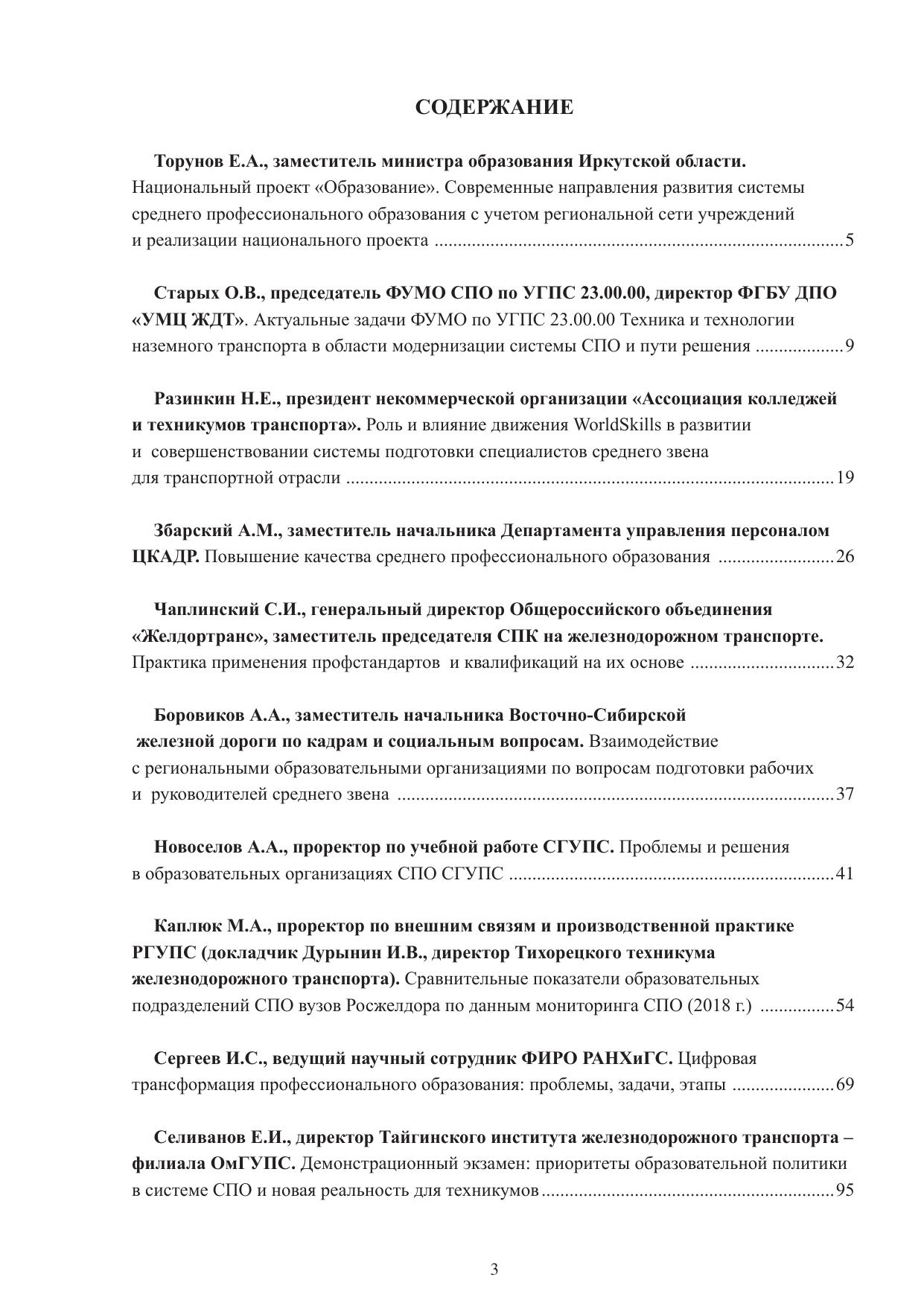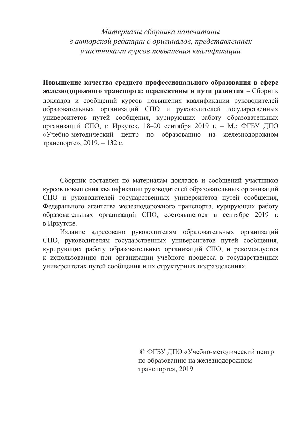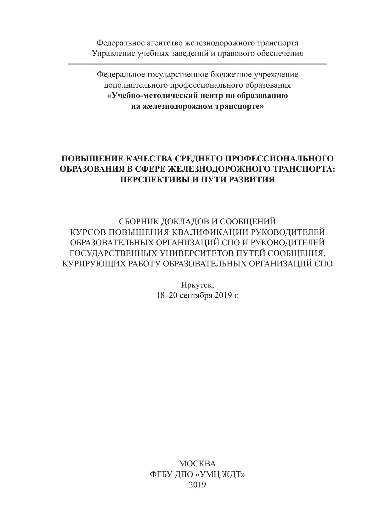 Сборник составлен по материалам докладов и сообщений участников курсов повышения квалификации руководителей образовательных организаций СПО и руководителей государственных университетов путей сообщения, Федерального агентства железнодорожного транспорта, курирующих работу образовательных организаций СПО, состоявшегося в сентябре 2019 г. в Иркутске.