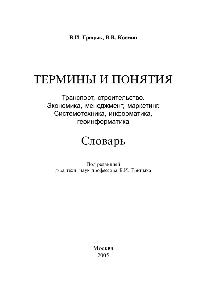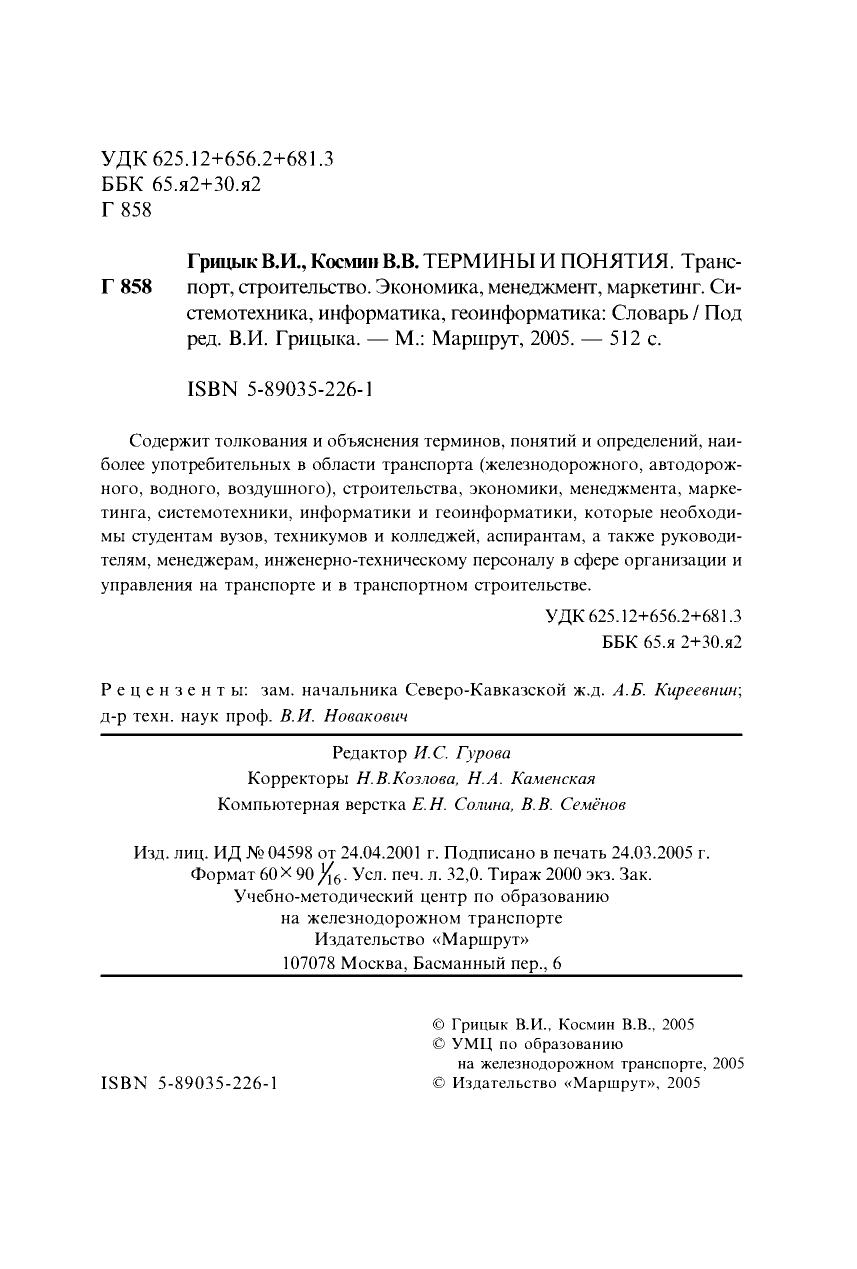 Грицык, В.И. ТЕРМИНЫ И ПОНЯТИЯ Транспорт, строительство. Экономика, менеджмент, маркетинг. Системотехника, информатика, геоинформатика Словарь : словарь / В. И. Грицык, В. В. Космин. — Москва : Издательство "Маршрут", 2005. — 512 с. — 5-89035-226-1. — Текст : электронный // УМЦ ЖДТ : электронная библиотека. — URL: https://umczdt.ru/books/997/227174/ (дата обращения 17.02.2026). — Режим доступа: по подписке.