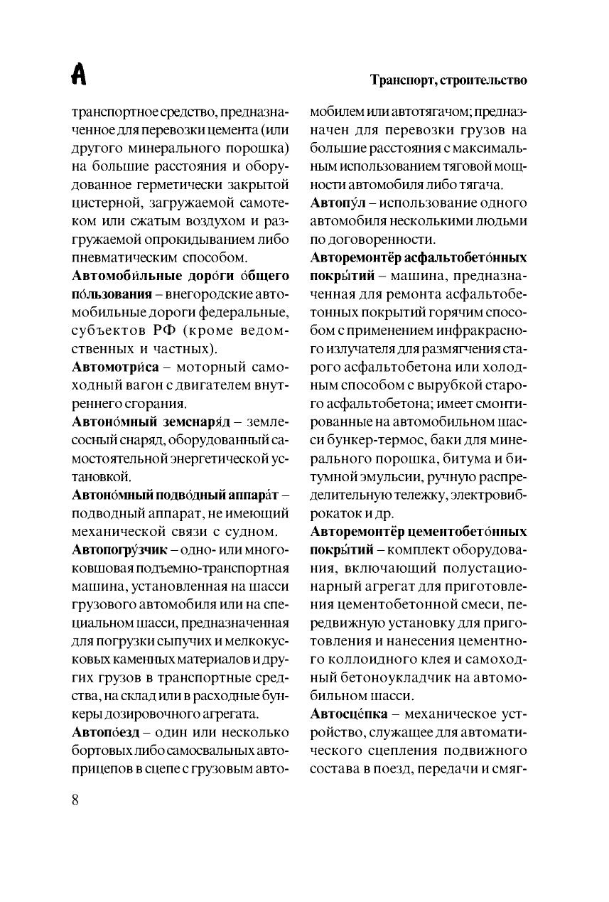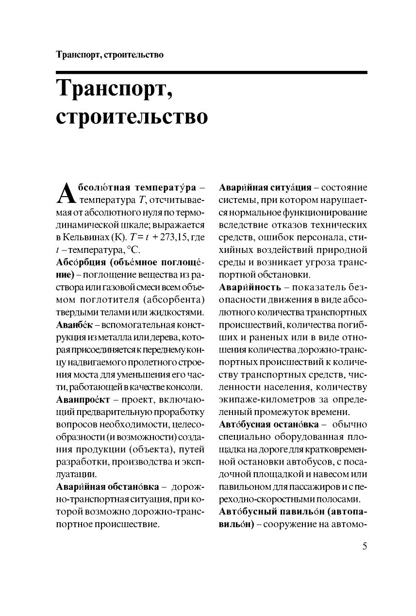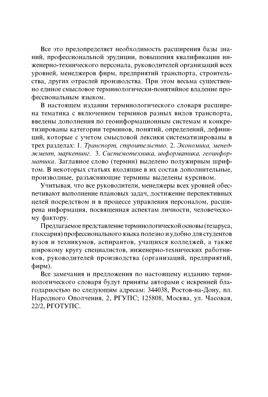 Содержит толкования и объяснения терминов, понятий и определений, наиболее употребительных в области транспорта (железнодорожного, автодорожного, водного, воздушного), строительства, экономики, менеджмента, маркетинга, системотехники, информатики и геоинформатики, которые необходимы студентам вузов, техникумов и колледжей, аспирантам, а также руководителям, менеджерам, инженерно-техническому персоналу в сфере организации и управления на транспорте и в транспортном строительстве.